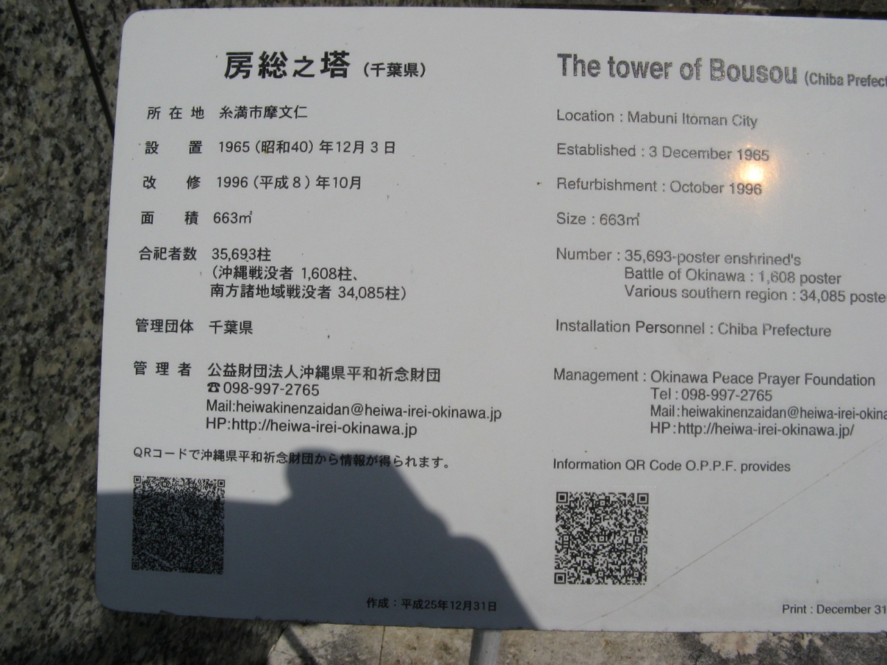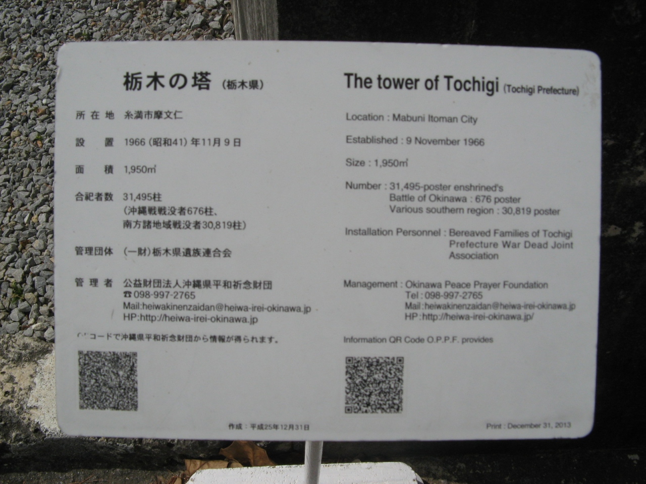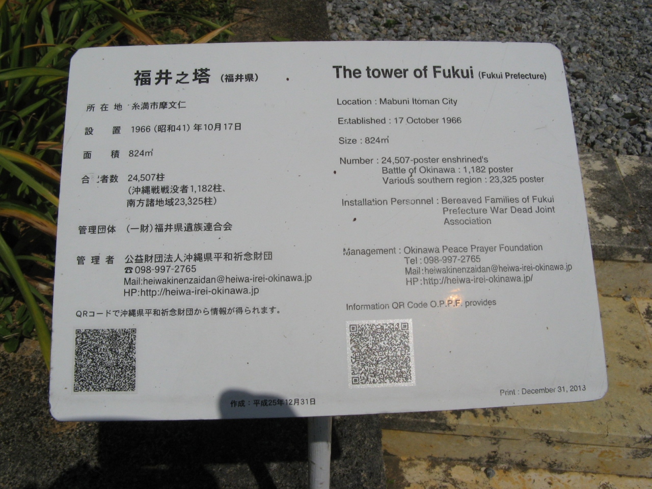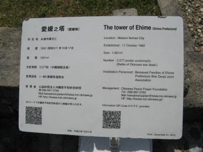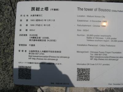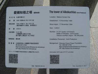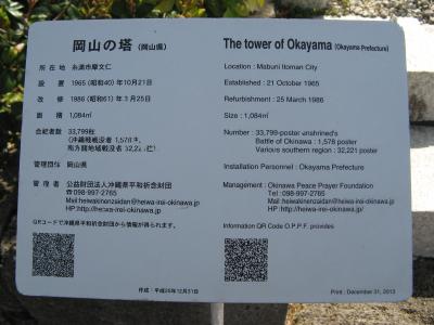 英霊が戦死された場所や人数を地図で示している慰霊塔は他にはなく、お参りされる関係者が子供たちに教えるのによいアイデアだと思いました。平和祈念公園には、国立沖縄戦没者墓苑を中心とし、各都道府県、自治体、遺族会などの慰霊碑が数多く建立されていて位置関係が判りにくいです。入園したら最初に公園案内所で、“平和祈念公園”の地図を入手されることをオススメします。- 旅行時期