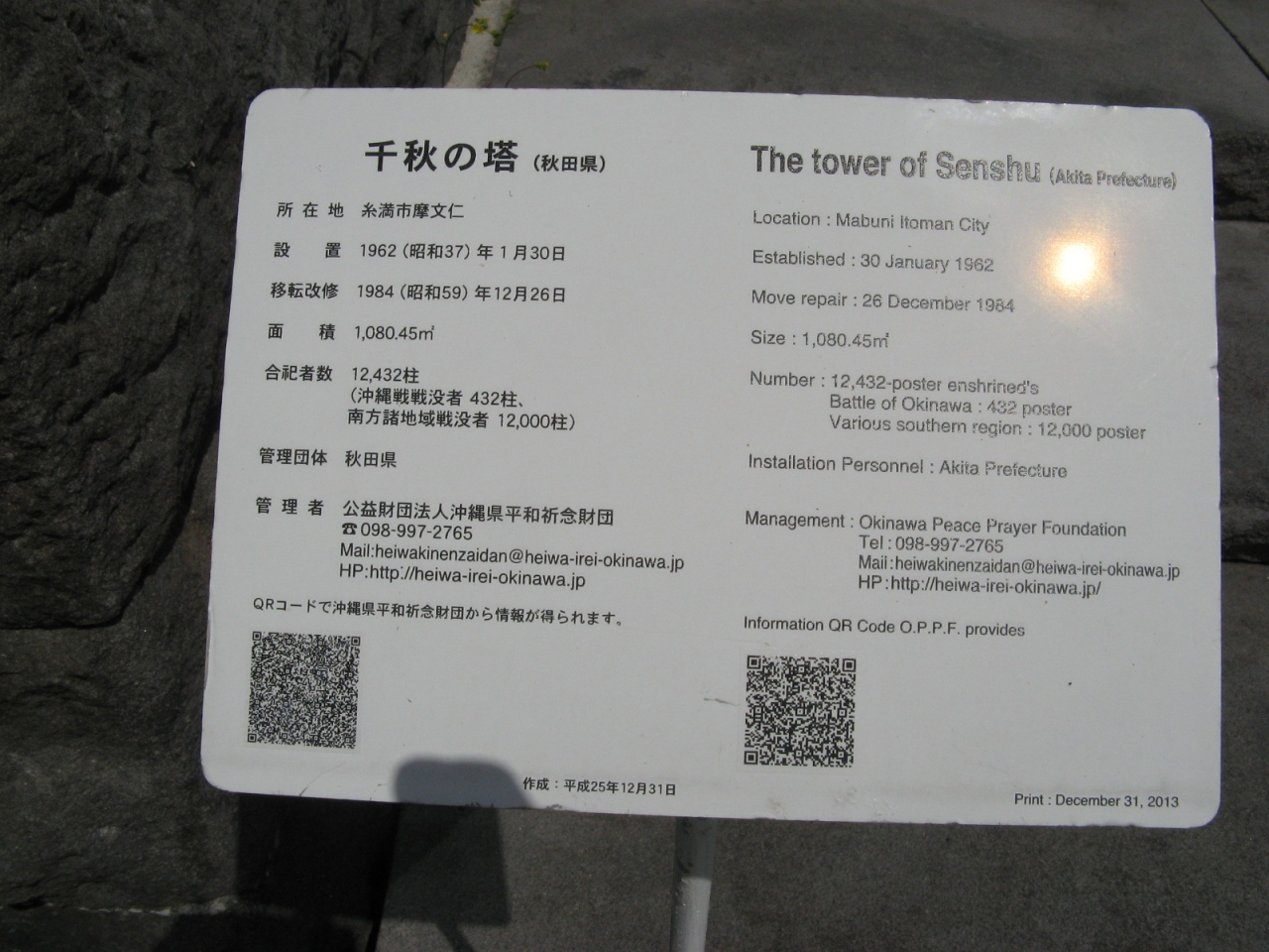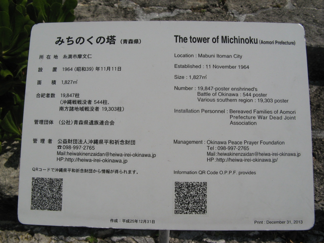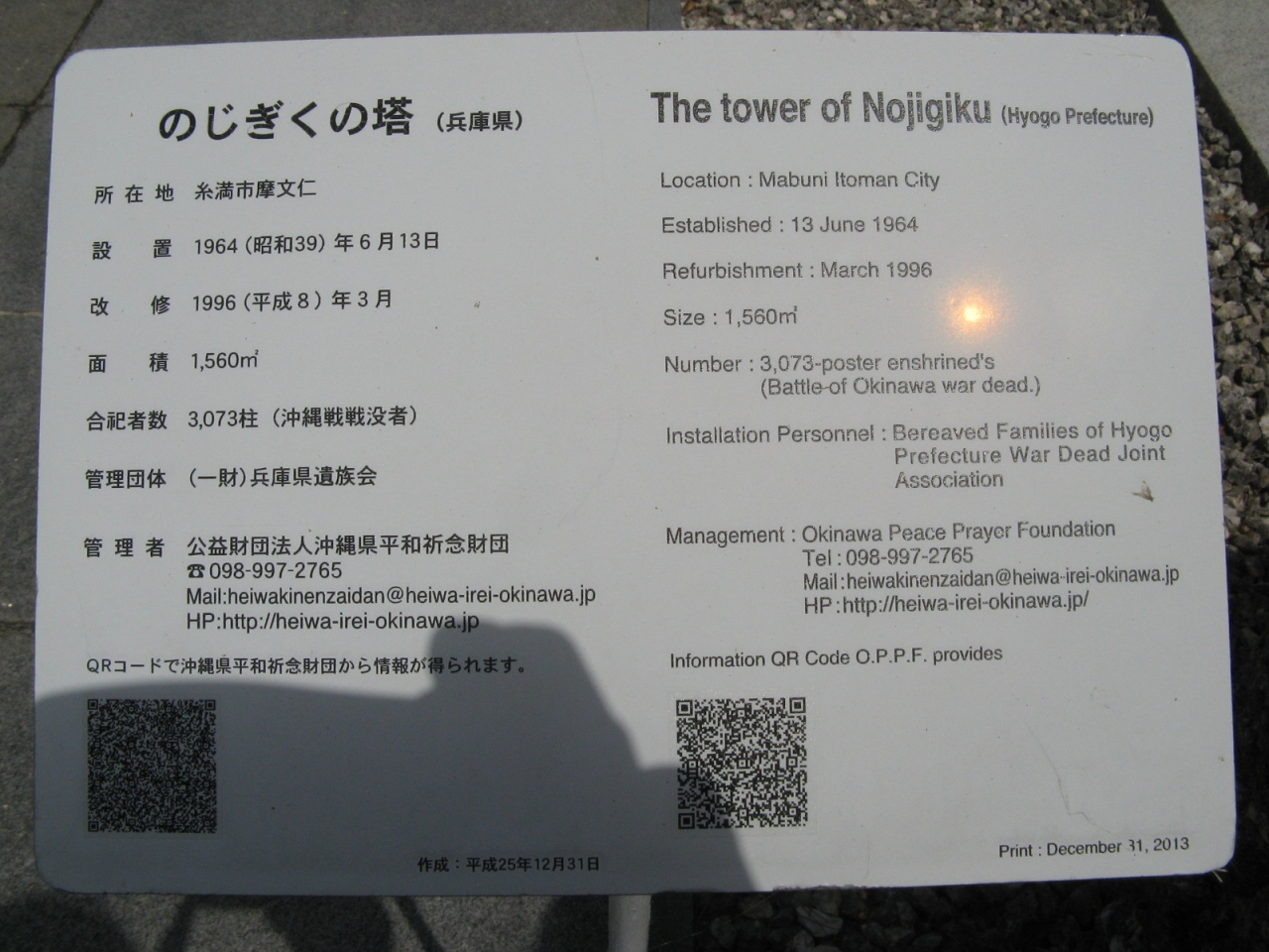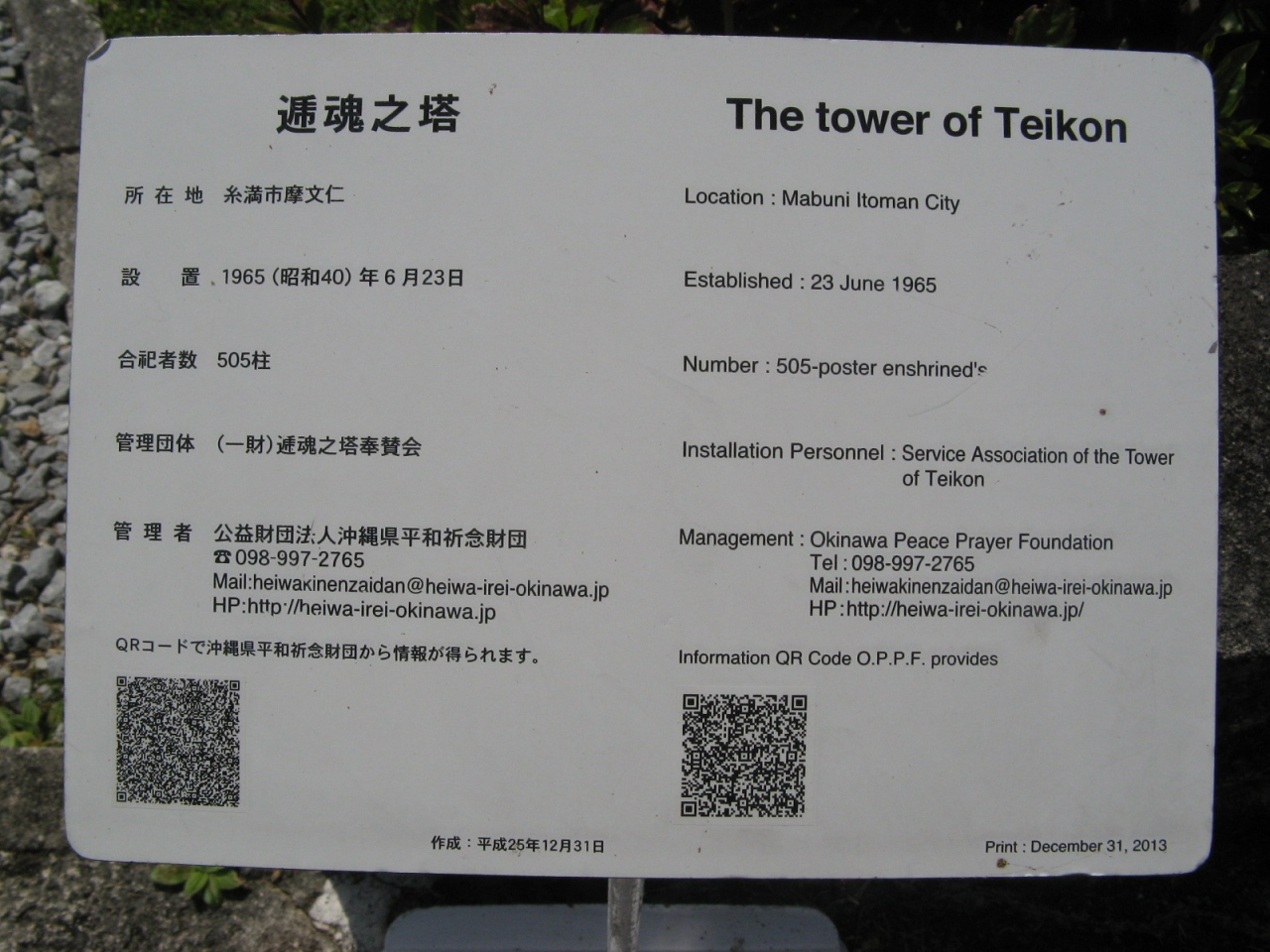 英霊が戦死された場所や人数を地図で示している慰霊塔は他にはなく、お参りされる関係者が子供たちに教えるのによいアイデアだと思いました。平和祈念公園には、国立沖縄戦没者墓苑を中心とし、各都道府県、自治体、遺族会などの慰霊碑が数多く建立されていて位置関係が判りにくいです。入園したら最初に公園案内所で、“平和祈念公園”の地図を入手されることをオススメします。- 旅行時期