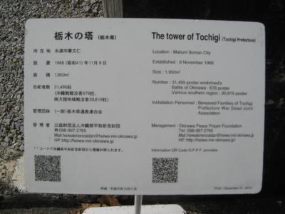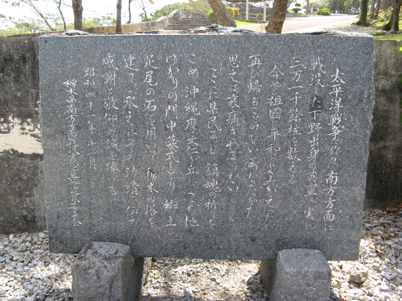 「栃木の塔」の傍には、「島守の塔」と「のじぎくの塔(兵庫県)」があります。「島守の塔」には、最後の官選沖縄県知事であった島田叡知事と、知事と二人三脚で戦時下の県民の救済に当たった荒井退造警察部長も祀られています。島田知事は兵庫県ご出身、荒井部長は栃木県ご出身なので、それぞれのご出身を考慮してこれらの慰霊塔のロケーションを決められたのでしょうか。- 旅行時期