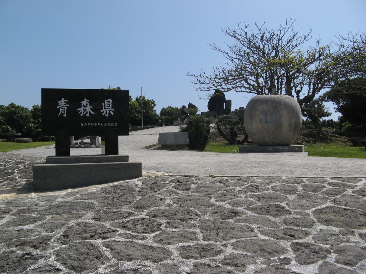 平和祈念公園の平和の礎から霊域ゾーンに入ってすぐ、リンゴの形をした碑文がある青森県の“みちのくの塔”の隣にあります。