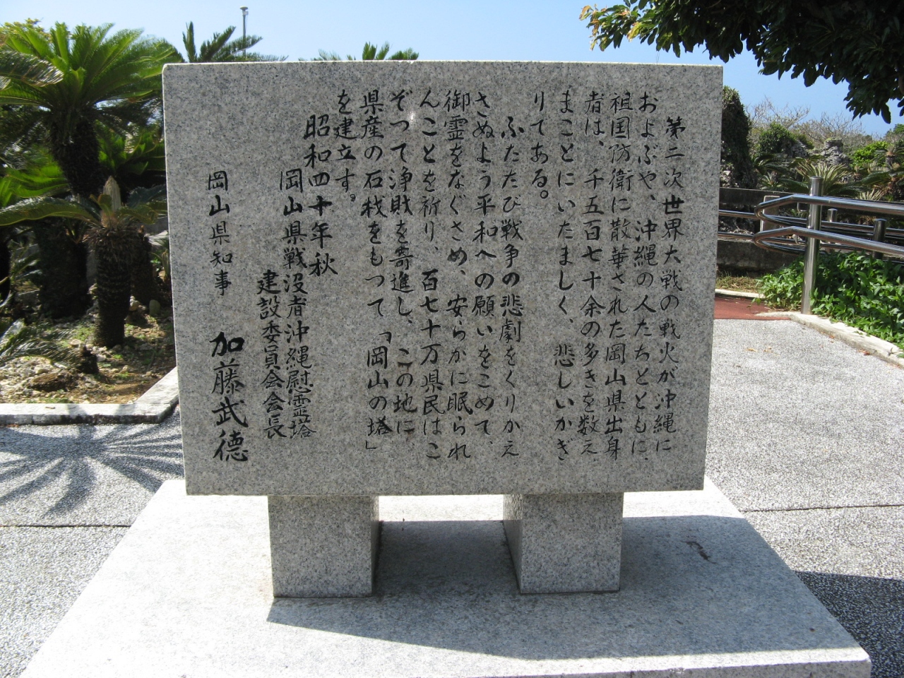 『第2次世界大戦の戦火が沖縄におよぶや、沖縄の人たちとともに、祖国防衛に散華された岡山県出身者は、 1,570余の多きを数えまことにいたましく、かなしいかぎりである。ふたたび戦争の悲劇をくりかえさぬよう平和への願いをこめて、御霊をなぐさめ、安らかに眠られんことを祈り、 170万県民はこぞって浄財を寄進し、この地に県産の石材をもって「岡山の塔」を建立す。』