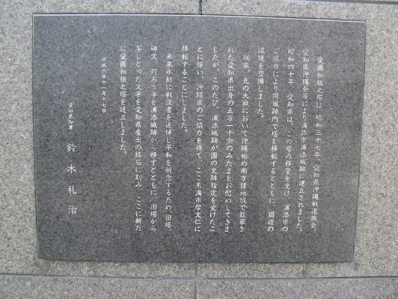 沖縄戦では愛知県出身者は第六十二師団に所属し浦添一帯で米軍と激闘を重ねたことから、愛国知祖之塔は、当初、浦添市浦添城跡に建立されが、浦添城跡が国の史跡指定を受けたことに伴い、この地に移されたものです。