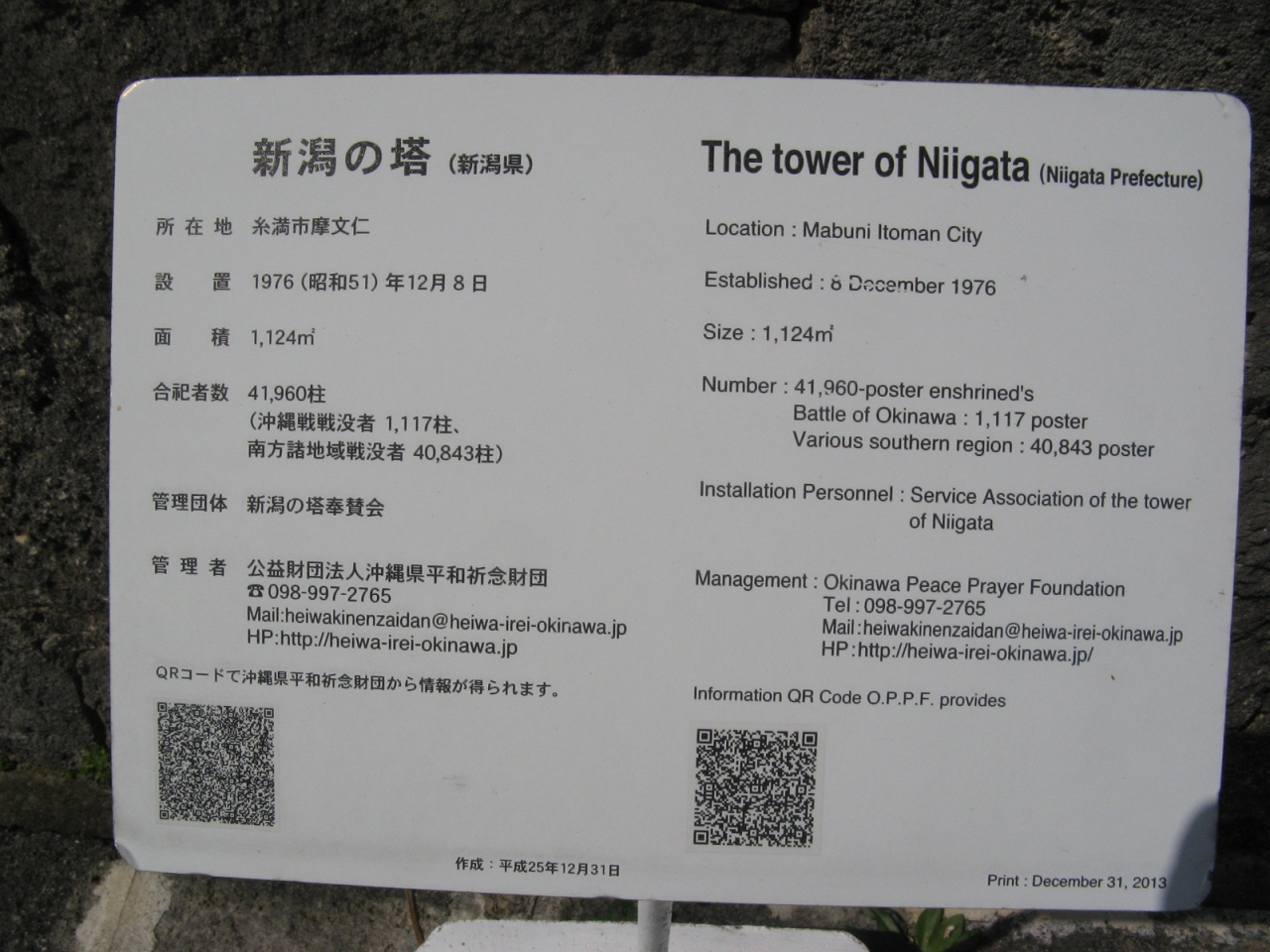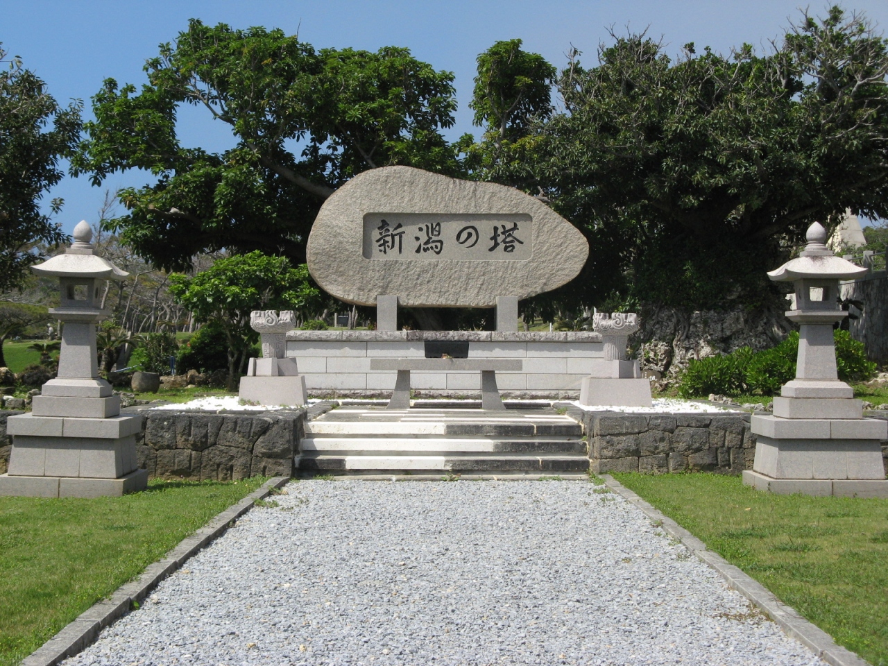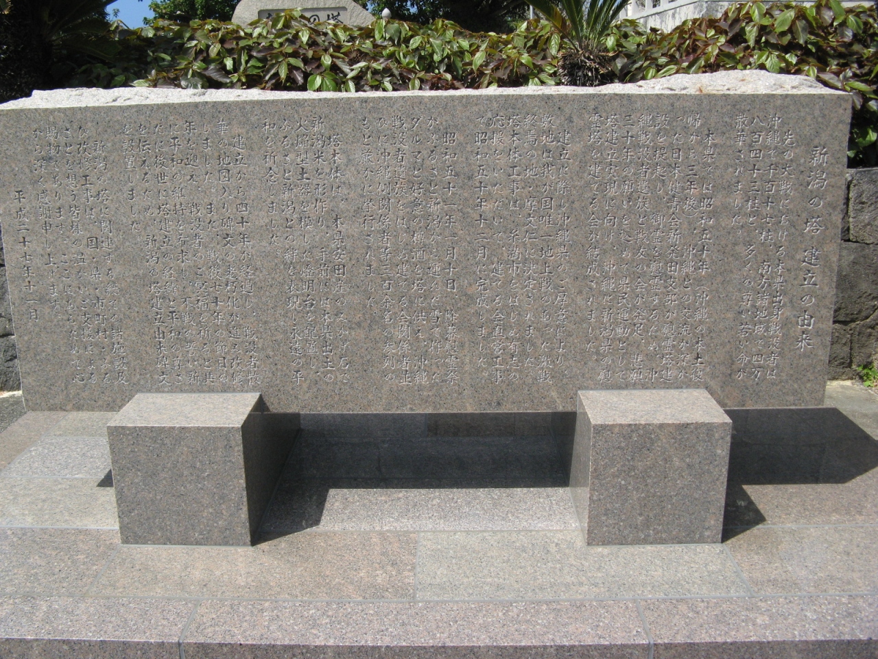 もともと、新潟県の戦没者慰霊碑は新潟県護国神社内に建てられていたそうですが、各県が沖縄に慰霊塔を続々と建立したことから、沖縄に慰霊塔がないのは新潟県のみとなったことや、また、昭和47年の沖縄本土復帰を機に、沖縄を訪れる県民も増え、沖縄に慰霊塔建立を求める県民の声が相次いだことから、昭和51年にここに建立したもので、沖縄における都道府県の慰霊塔としては最後に建てられたものとなりました。