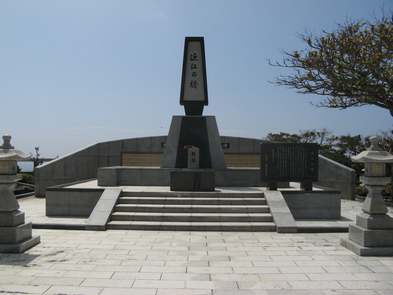 塔は、高さのある基壇の上に細めの塔体を載せたシンプルなデザインとなっていて、その前面左右に燈篭を配置しバランスをとっています。塔の背面には、戦没された1,673名のが刻まれた「沖縄方面霊名碑」が置かれています。