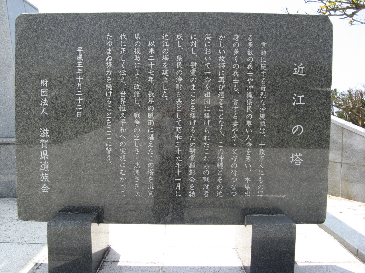 “近江の塔の碑銘”に“近江大橋”の写真が使われています。滋賀県のシンボルとして、また、参拝者が遠目にでもわかりやすいようにと、使われたのだと思いますが、他の都道府県の慰霊塔にないデザインなので少し違和感を感じました。