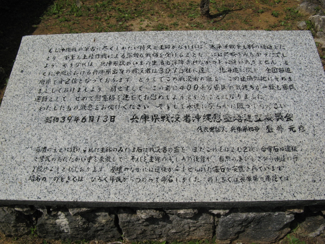石碑には、『過ぐる太平洋戦争最終の激戦場ここ沖縄の地に県人2,076名が壮烈な戦死をとげられたこの遺烈をたたえ冥福を祈って郷党相はかりはるかに故山の石を運び慰霊の塔を建てる。 昭和37年10月』の碑文が記されています。
