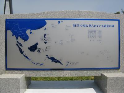 慰霊塔は、米どころ新潟を象徴するお米の形をしたシンプルなもので、塔の前には新潟の笹山遺跡から出土した土器のオブジェが2基、塔の周辺に県人が戦死された場所や数を伝ええるチタン製の地図、建立の由来を記した石碑などがあります。