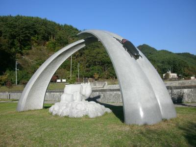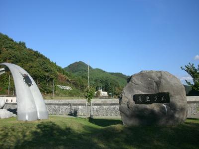 ダム堤体の下流側は芝生広場になっていて、カモシカや蛍をモチーフとしたモニュメントがあります。でっかい蛍のモニュメントは少し気味が悪いくらいリアルにできていました。