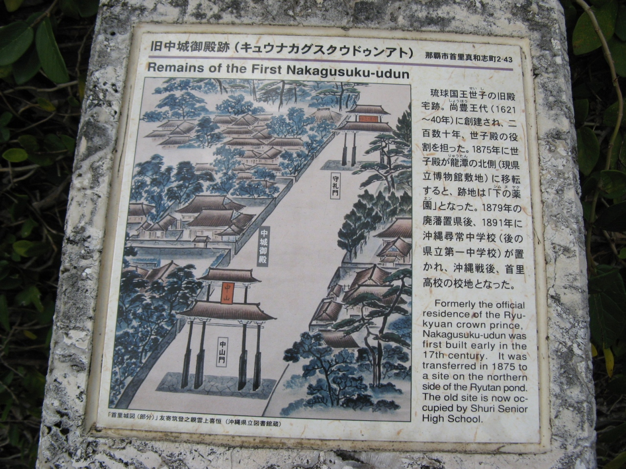 「中城御殿」は、沖縄戦で破壊され建物内に保管された大事な宝物も散逸してしまい、復帰後はこの地に沖縄県立博物館が建てられましたが、博物館は2006年おもろまちへ移転されました。石標(説明板)にある“現県立博物館”は、おもろまちへ移転した博物館のことで、現在は、御殿に関する建物などは全くなくて、その跡地の発掘調査が進められいます。石標(説明板)の表記に判りにくいところがありますが、その絵図を見て、立派な御殿がこの地にあったことがうかがえました。発掘調査が進み、今後の復元を期待したいと思いました。- 旅行時期