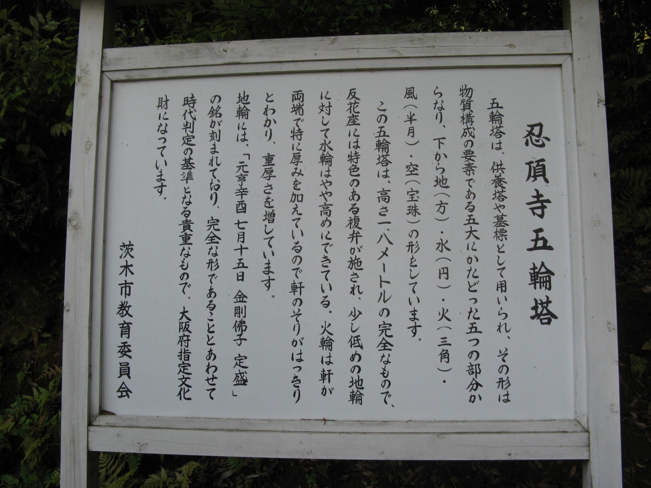 「忍頂寺」は、織田信長の保護を受けたが、高山右近が切支丹宗伝播のため寺院を焼いて寺領を没収したという歴史を持つお寺さんです。焼き討ちにあっても完璧な姿で残った五輪塔は堂々たるもので、見ごたえがあります。「忍頂寺」を参拝されたら、是非、ご覧になられることをオススメします。- 旅行時期