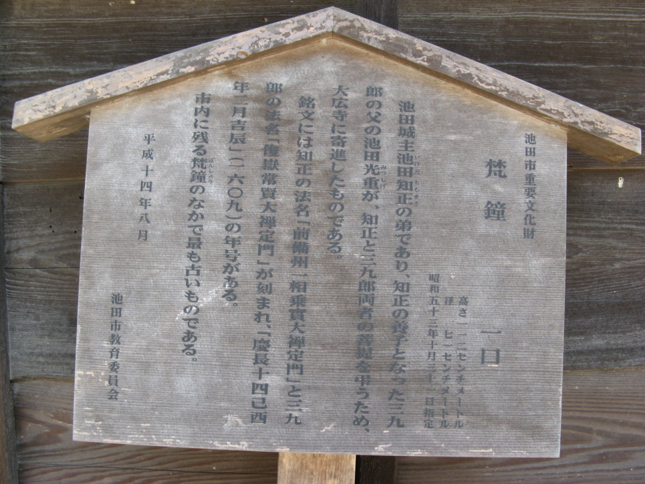 応永2年(1395年)に池田城主の池田充正が創建したという歴史あるお寺さんです。代々の池田城主のお墓や池田氏が寄進した梵鐘などがあります。