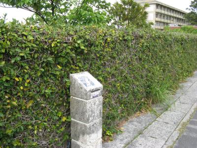首里高等学校の西端付近の県道50号線(寒川通り)沿いに「旧中城御殿跡」の石標(説明板)があります。