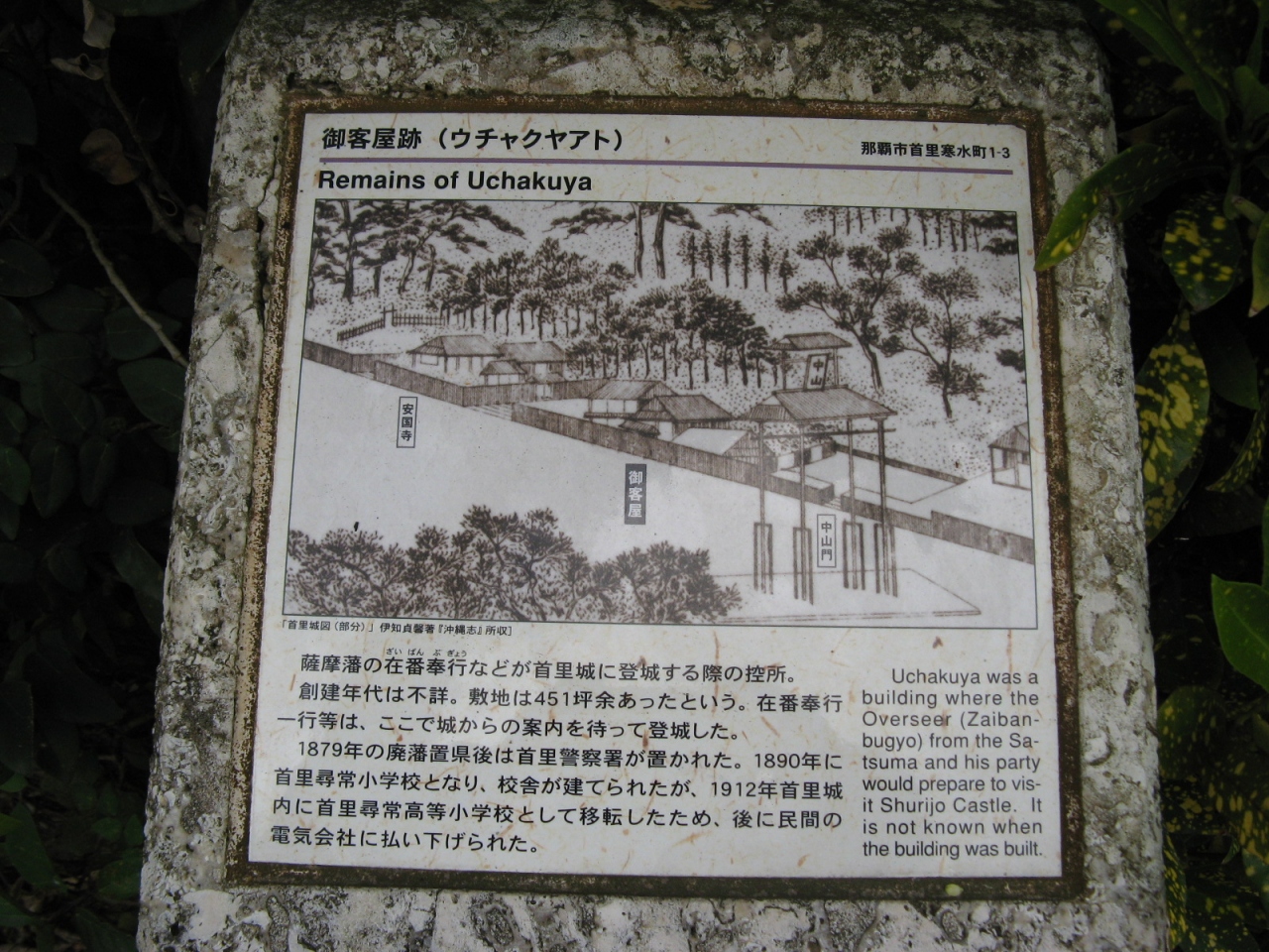 石標には、古い御客屋の絵図とともに、『薩摩(さつま)藩の在番奉行(ざいばんぶぎょう)などが首里城に登城(とうじょう)する際の控所。創建年代は不詳。敷地は451坪余あったという。在番奉行一行等は、ここで城からの案内を待って登城した。1879年の廃藩置県後は首里警察署が置かれた。1890年に首里尋常小学校となり、校舎が建てられたが、1912年首里城内に首里尋常高等小学校として移転したため、後に民間の電気会社に払い下げられた。』と表記されています。