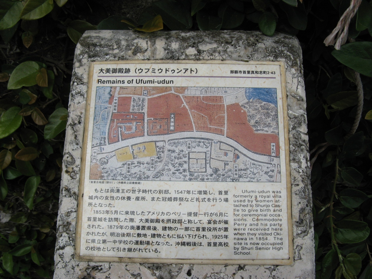1853年5月に来琉したアメリカのペリー提督一行が6月に首里城を訪問した際、大美御殿を摂政邸と称して、宴会が催された。1879年の廃藩置県後、建物の一部に首里役所が置かれたが、明治後期に敷地・建物ともに払い下げられ、1925年に県立第一中学校の運動場となった。沖縄戦後は、首里高校の校地として引き継がれている。』と表記されています。