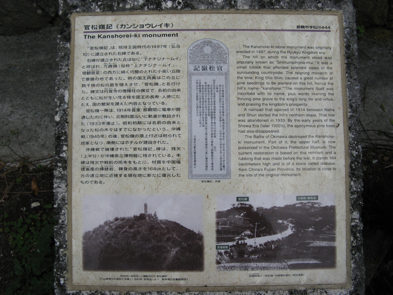 石標の説明によると、『官松嶺は、かつては眺望の良い小高い景勝地で、1497年に尚真王がこの丘に数千株の松の苗を植えさせて、頂上に「官松嶺記」の碑を建立した。以来、この丘を官松嶺と称した。官松嶺一帯は、1914年首里・那覇間の電車軌道の敷設などによって、昭和初期には名前の由来となった松の木々はすでになく、沖縄戦の後には、官松嶺の頂上付近が削られて民家やホテルが建設された。沖縄戦で破壊された「官松嶺記」の碑は、上半分が沖縄県立博物館・美術館に保存されている。』と記載されています。詳細については、添付写真を参照ください。