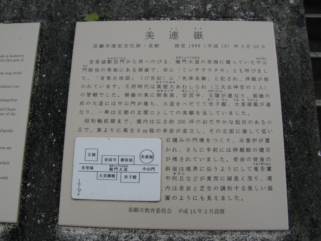 世界遺産のひとつ、“玉陵”のすぐ近く、寒川通り(県道50号線)に面する“琉染”と言う染物屋さんの向かい側の道路沿いに「美連嶽」の説明板が建っています。