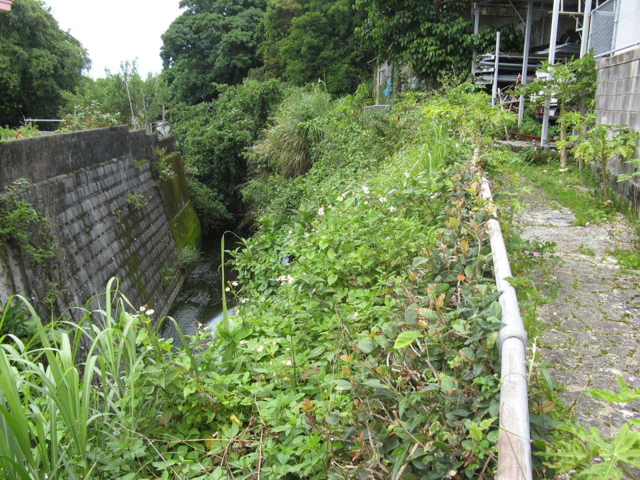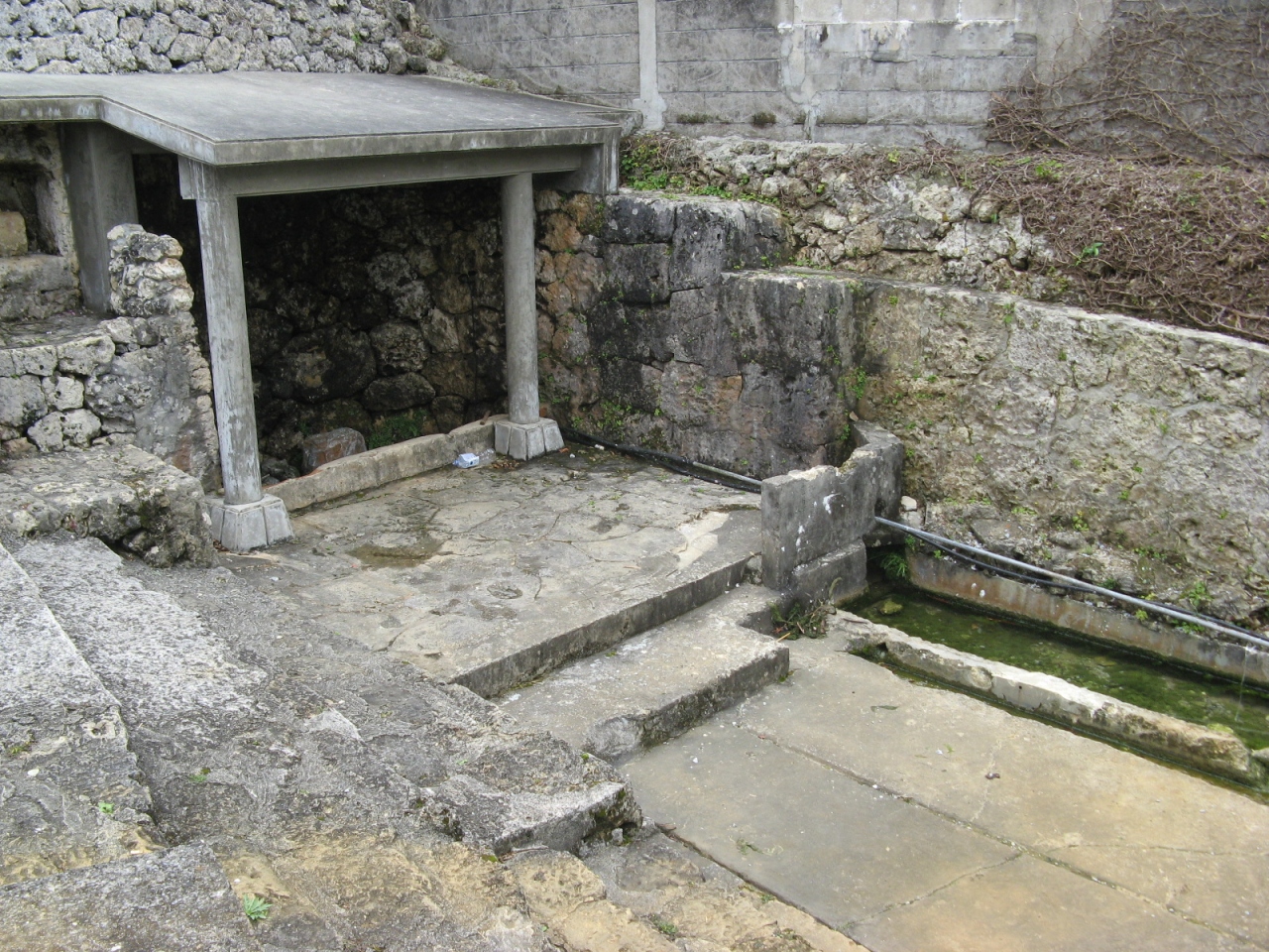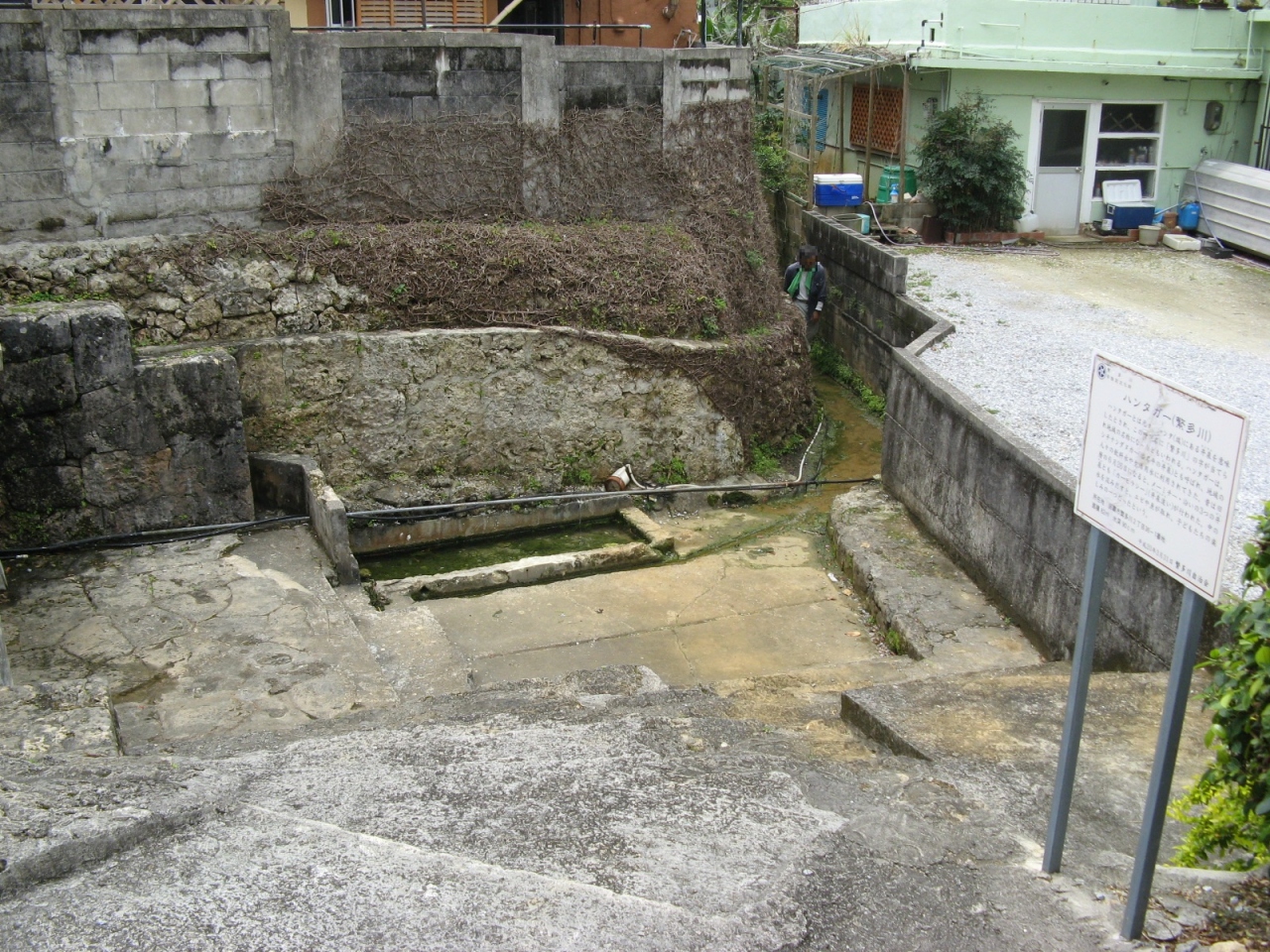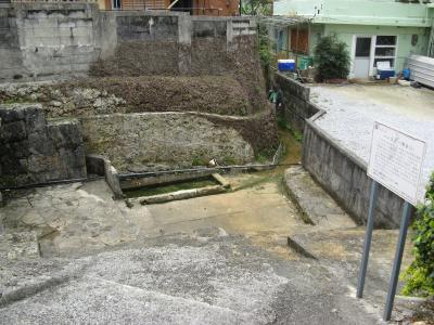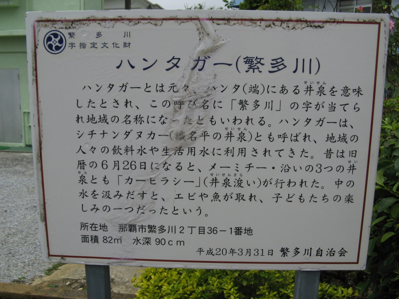 那覇市立松城中学校の南すぐのところに「繁多川」があります。繁多川(ハンタガー)は、昔から使われてきた湧き水を利用した井泉(共同井戸)で、住宅に囲まれた窪地に琉球石灰岩で造られた井泉があって今も水が湧き出ています。水が飲めるのかどうか判りませんでしたが、この井泉は字指定の文化財になっており、しっかりと管理・保存されている印象を受けました。