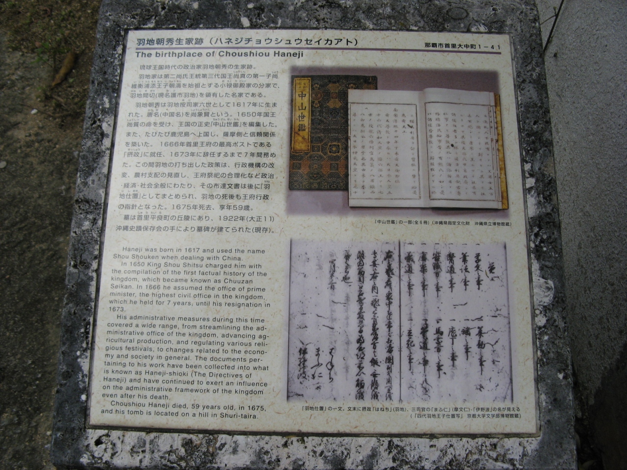 羽地朝秀は琉球王国時代、首里王府の最高ポストである摂政に就任し、行政機構の改革や農村支配の見直し、王府祭祀の合理化など、政治・経済・社会全般にわたって活躍するとともに、王国の正史『中山世鑑』を編集した政治家。詳細については、現地にあった石碑の説明板の写真を添付しますので参照ください。