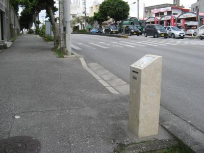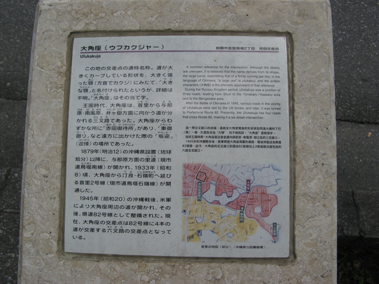 沖縄の方言で「ウフ」は多いとか大きいという意味があり、また、「アゴ」のことを「カクジ」と言うそうで、何本もの道路が交差し角張った動物のあごの形に似ていることから大きな顎(ウフカクジャー)」と名付けられ、その当て字として「大角座(ウフカクザ)」となったとか。現在は6本の道路が交差し、交通量の多い要所となっています。現地には「大角座」と書かれた説明用の標石があるのみで、観光するような遺構はなにも残っていません。詳細については、標石の写真を添付しますので参照ください。- 旅行時期