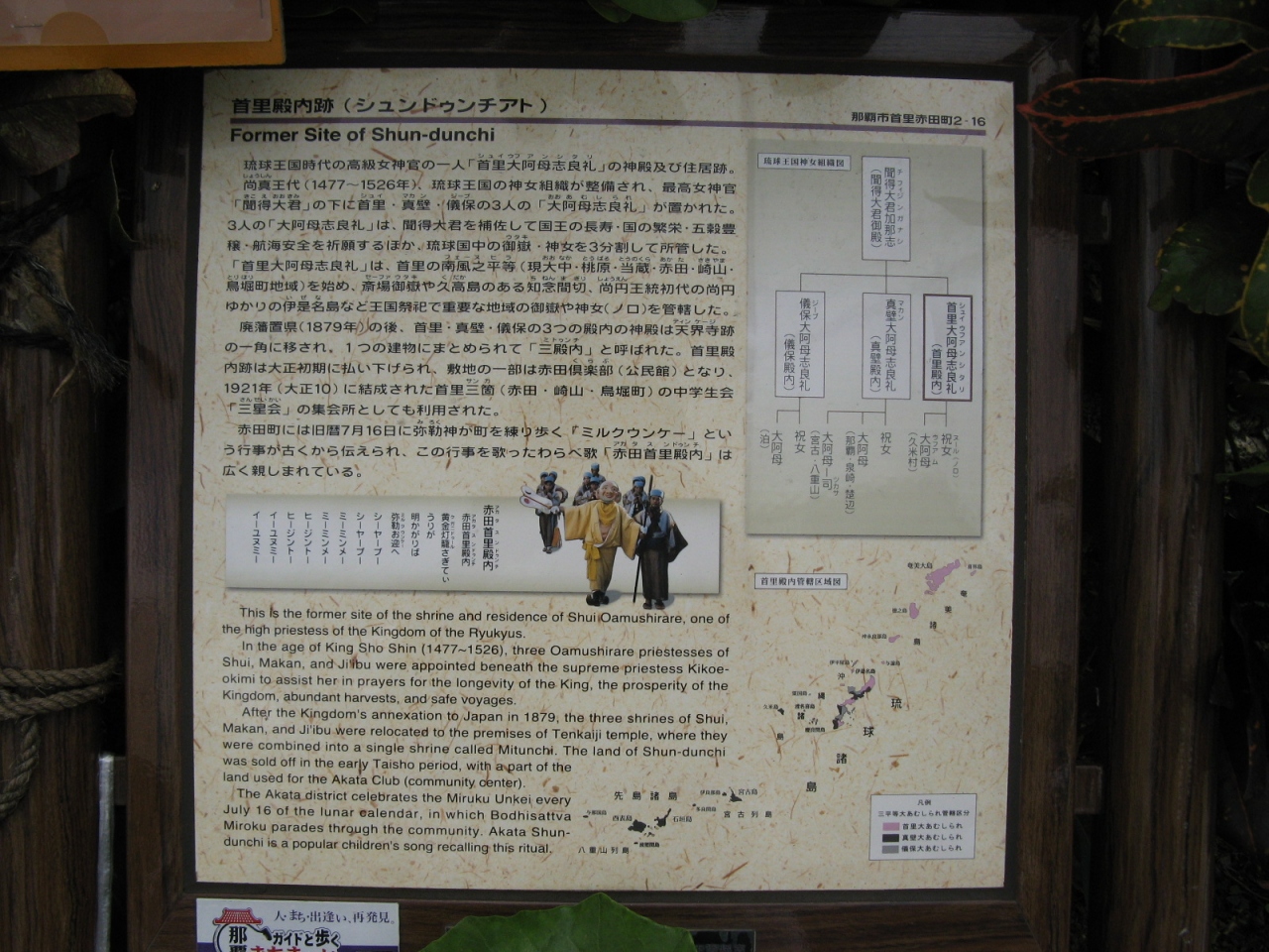 明治期に神殿は移設され、現在その跡地には赤田クラブという公民館が建っているだけで、遺構はなにも残っておらず、観るものはありませんが、説明板を見てたった3人の女神官が琉球全体にわたって重要な役割を果たしていたことに驚きました。