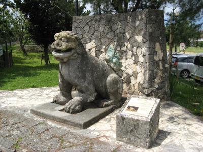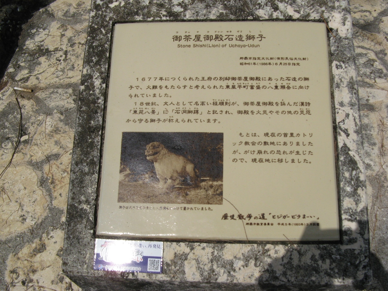 現地の説明板によると、この石獅子は1677年に作られ、王府の別邸・御茶屋御殿(現・首里カトリック教会)に置かれたとのこと。その場所に崖崩れの恐れが生じたため、現在はこの場所に移されたとか。