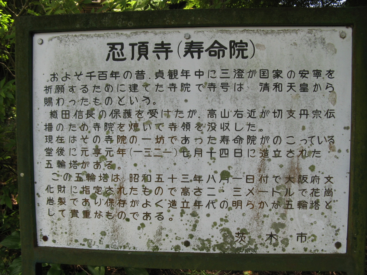 現地にある由緒書きには『およそ千百年の昔、貞観年中に三澄が国家の安寧を祈願するために立てた寺院で寺号は、清和天皇から賜ったものという。織田信長の保護を受けたが、高山右近が切支丹宗伝播のため寺院を焼いて寺領を没収した。現在はその寺院の一坊であった寿命院がのこっている。』と記載されています。詳細については由緒書きの写真を添付しますので参照ください。