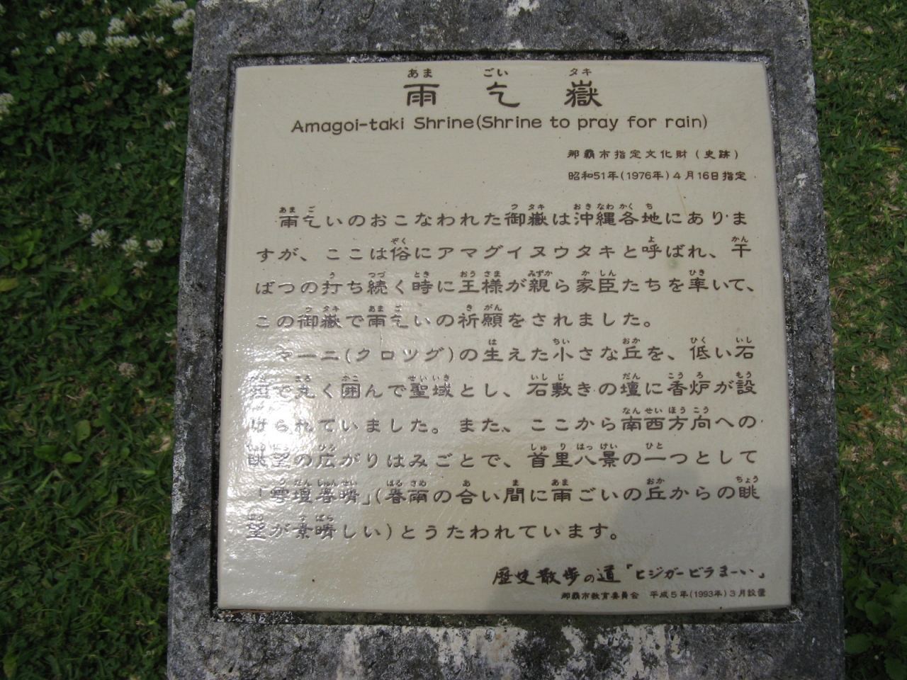 御嶽の説明板によると『雨乞いのおこなわれた御嶽(ウタキ)は沖縄各地にありますが、ここは俗にアマグイヌウタキと呼ばれ、干ばつの打ち続くときに、王様が親(みずか)ら家臣たちを率いて、この御嶽で雨乞いの祈願をされました。 マーニ(クロツグ)の生えた小さな丘を、低い石垣で丸く囲んで聖域とし、石敷きの壇に香炉が設けられていました。
