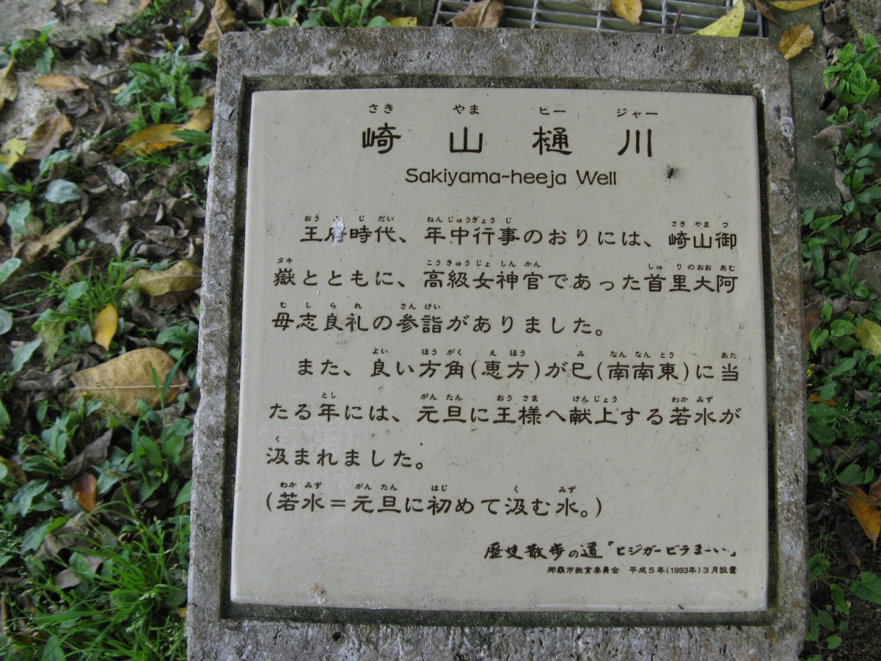 現地にある説明板によると『王府時代、年中行事のおりには、崎山御嶽とともに、高級女神官であった首里大阿母志良礼(シュリノオオアムムシラレ)の参詣がありました。また、良い方角(恵方)が巳(南南東)に当たる年には、元旦に王様に献上する若水(元旦に初めて汲む水)が汲まれました。』とあります。添付写真を参照ください。