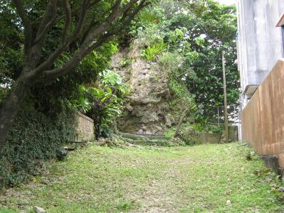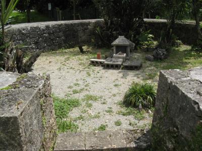 御嶽(うたき)は、琉球の信仰における祭祀などを行う施設で、現地の説明板によると、『昭和戦前期まで境内は広さ約250坪ほどのおだやかな起伏のある小丘で、一面芝生が広がり、高さ5m程の奇岩が直立する奇岩と芝生の調和する美しい庭園のようにも見えました。』とありますが、現在、その境内には、民家が建ち、民家の間に御嶽の岩がせまくるしく残されているだけで昔の面影は残っていません。しかし、御嶽の祭壇には香炉があり、今も拝所として守られているようです。