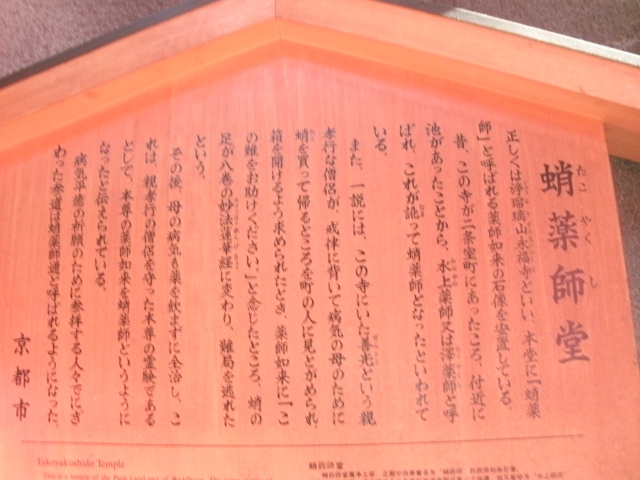 阪急電車の河原町駅から歩いて5分ほど、アーケードがかかる新京極通りの中ほどにあります。正式には永福寺という名前だそうで、蛸薬師という名前は諸説あるようですが、かつてこの寺にいた親孝行な僧が病身の母の求めで「タコ」を買ったが見とがめられ、進退窮まった僧が日頃信仰する薬師如来に祈念したところ、タコは薬師経に変わり、また母の病が癒えたというの説が一番有名だそうです。詳細は添付写真の駒札を参照ください。