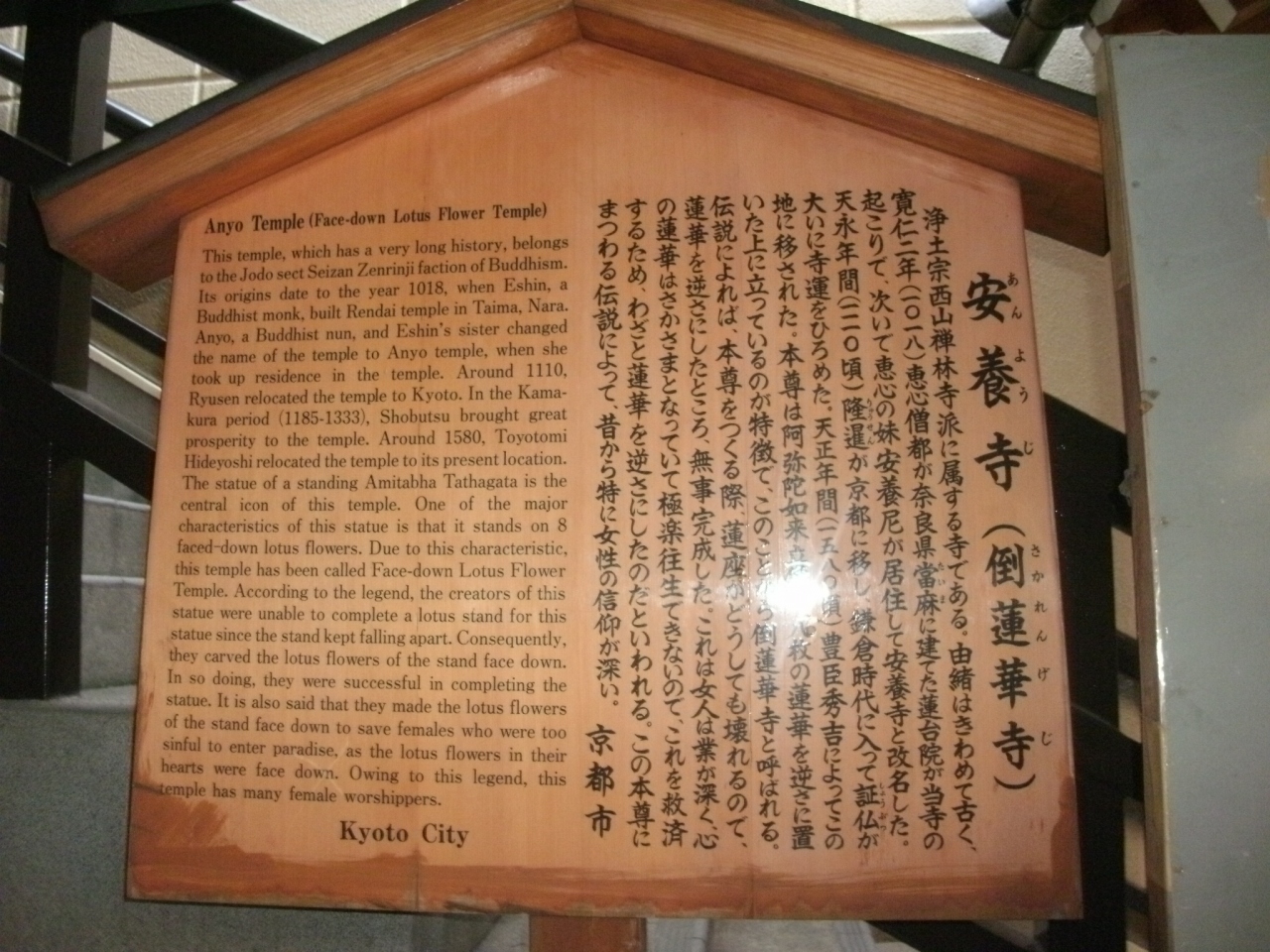 阪急電車の河原町駅から歩いて5分ほど、アーケードがかかる新京極通りの中ほど近くにあります。倒蓮華寺(さかれんげじ)と呼ばれている、古い由緒をもつお寺さんです。入口横にある由緒書きには、『ご本尊を作る際、台座がどうしても壊れるので、蓮華の台座を逆さにしたところ、無事完成した。これは、女人は業が深く、心の蓮華が逆さになっていて極楽浄土に往生できないので、それを救うためにわざと蓮華を逆さにした』とあります(詳細は添付写真を参照ください)。鉄筋コンクリート造りの建物にあって、一階部分に北向地蔵尊が祀られています。ご本尊は二階にある本堂に安置されていて、ガラス戸の外から拝むことになります。お寺さんらしくない建物で参拝しにくいですが、女性を救う阿弥陀如来として信仰されているそうなので、興味のある女性に参拝をオススメします。