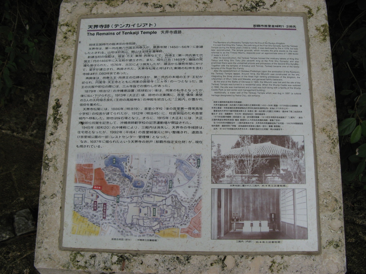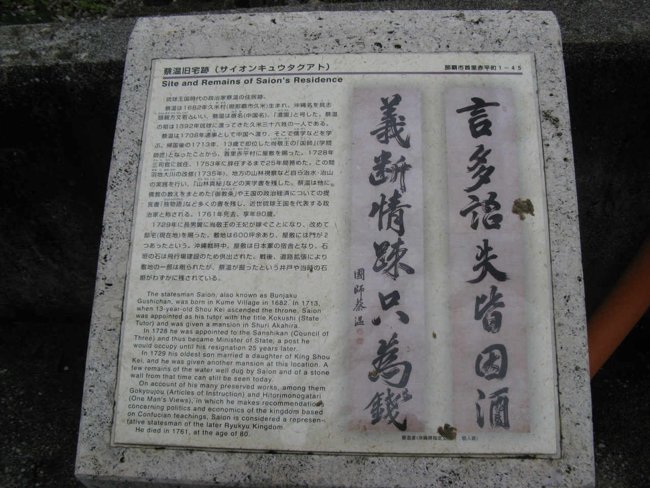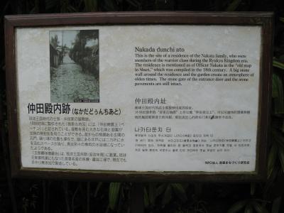 この旧宅跡は、1729年に尚敬王の王妃が、蔡温の長男の翼(よく)に嫁ぐことになり、国王より賜った邸宅の跡で、現在は駐車場となっていて、当時の石垣がわずかに残されているだけです。詳細については、現地にあった説明板の添付写真を参照ください。- 旅行時期