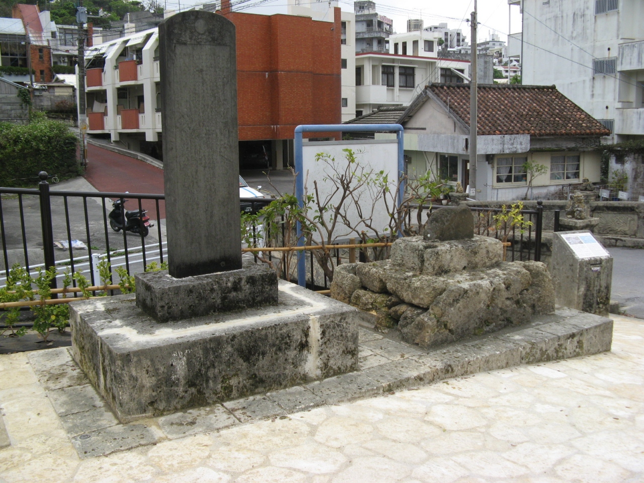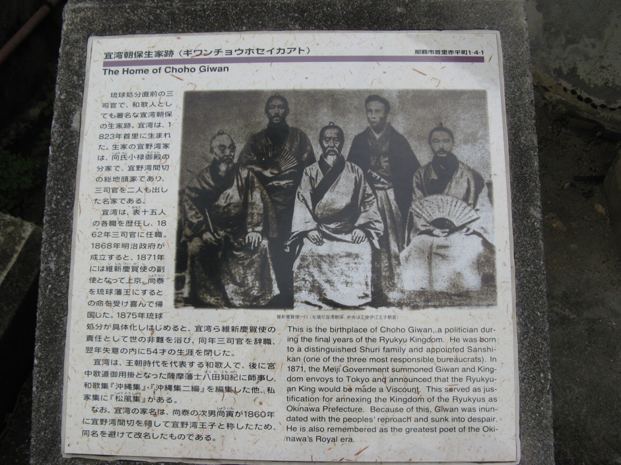 モノレール儀保駅より南へ歩いて3分ほどのところにあります。現地にある説明板には、『宜湾朝保は、琉球王国末期の著名な政治家で歌人。1862年三司官となり尚泰王を補佐。1868年に明治政府が成立すると、1871年に維新慶賀使の副使として上京、尚泰王を琉球藩王にするとの命を受け、喜んで帰国するも、親清国派から「売国奴」と非難されて、1875年に琉球処分が具体化しはじめると、維新慶賀使の責任として世の非難を浴び三司官を辞任。翌年失意の内に54歳の生涯を閉じた。』と記載されています。詳細は説明版の写真を添付しますので参照ください。なお、生家跡は、マンションになっていて往時の面影はまったくありません。