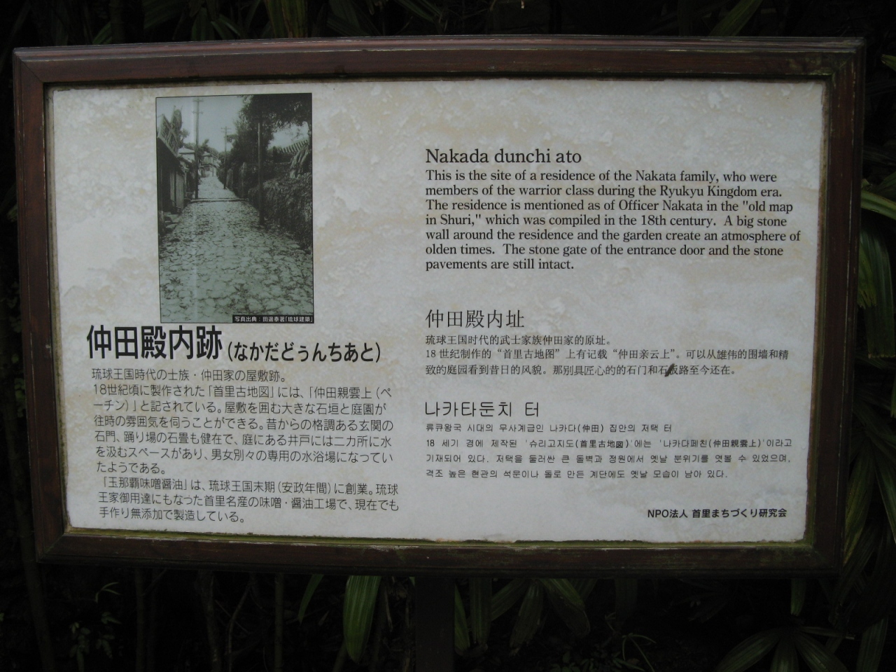 かって琉球王朝御用達で、創業160年以上になる老舗の味噌工場です。食品添加物や化学調味料を使わず、昔ながらの製法で作っておられるそうです。購入した“王朝みそ 864円”を味噌汁やサバの味噌煮で使用しました。味噌は黒っぽい茶色で見かけは塩辛そうに見えましたが旨みが濃くて美味しかったです。なお、このお店は、琉球王国時代の士族・仲田家の屋敷跡【仲田殿内(なかだどぅんち)】だそうで、お店を囲む立派な石垣がとてもよい雰囲気です。首里を散策されるときに立ち寄られることをオススメします。現地にある説明板の写真を添付しますので参照ください。