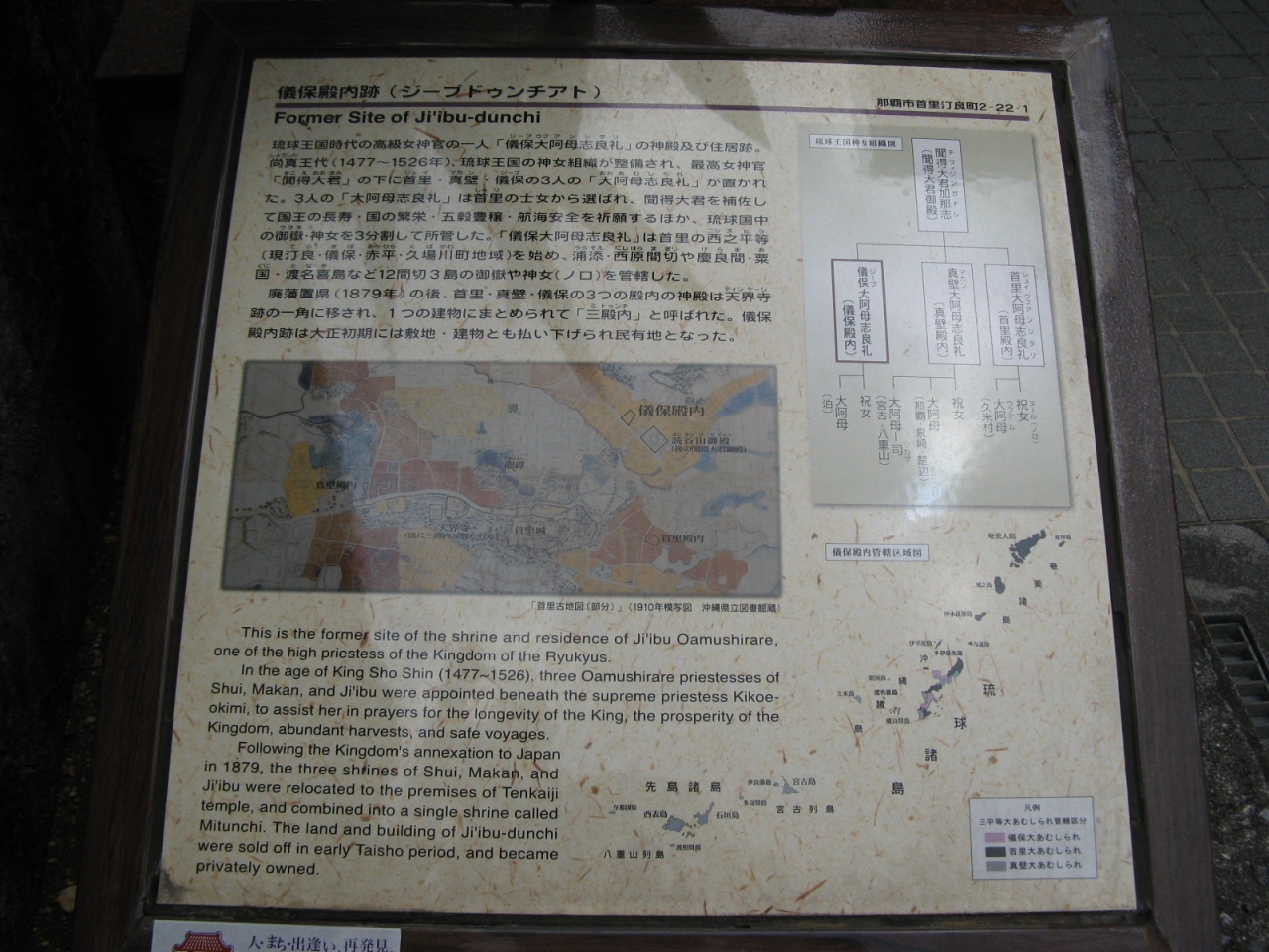 尚真王代(1477~1526年)琉球王国の国王を守護し、国王の長寿・国の繁栄・五穀豊穣・航海安全を祈願した高級女神官の一人「儀保大阿母志良礼」の神殿及び住居跡です。「儀保殿内跡」は大正初期には敷地・建物ともに払い下げられ民有地となり、現在はマンションが建ち、その遺構は全く残されていません。