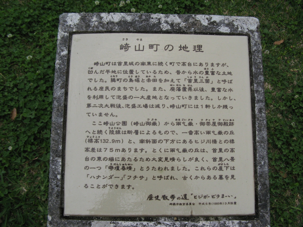 識名平(シチナンダ)は、金城橋から識名に至る坂のこと。呼称は方言の「シチナノヒラ」が転訛(てんか)して「シチナンダ」となり、さらに坂の意味を加えて「シチナンダビラ」ともいう。かつては、松並木の続く石畳の坂道であり、王家の別邸「識名園(しきなえん)」に通じ、また、首里から島尻(しまじり)方面に至る幹線道路の一部でもあった。』