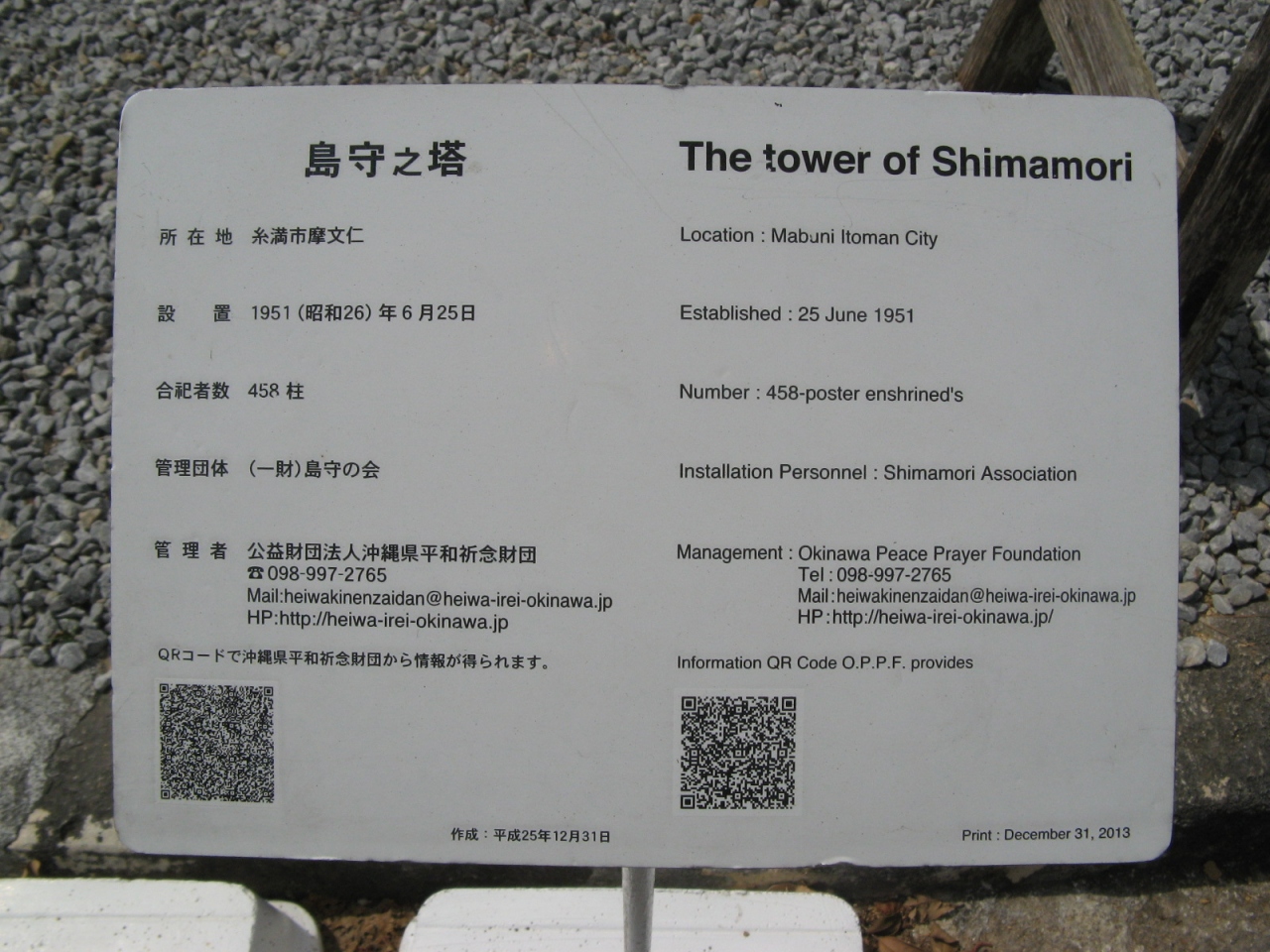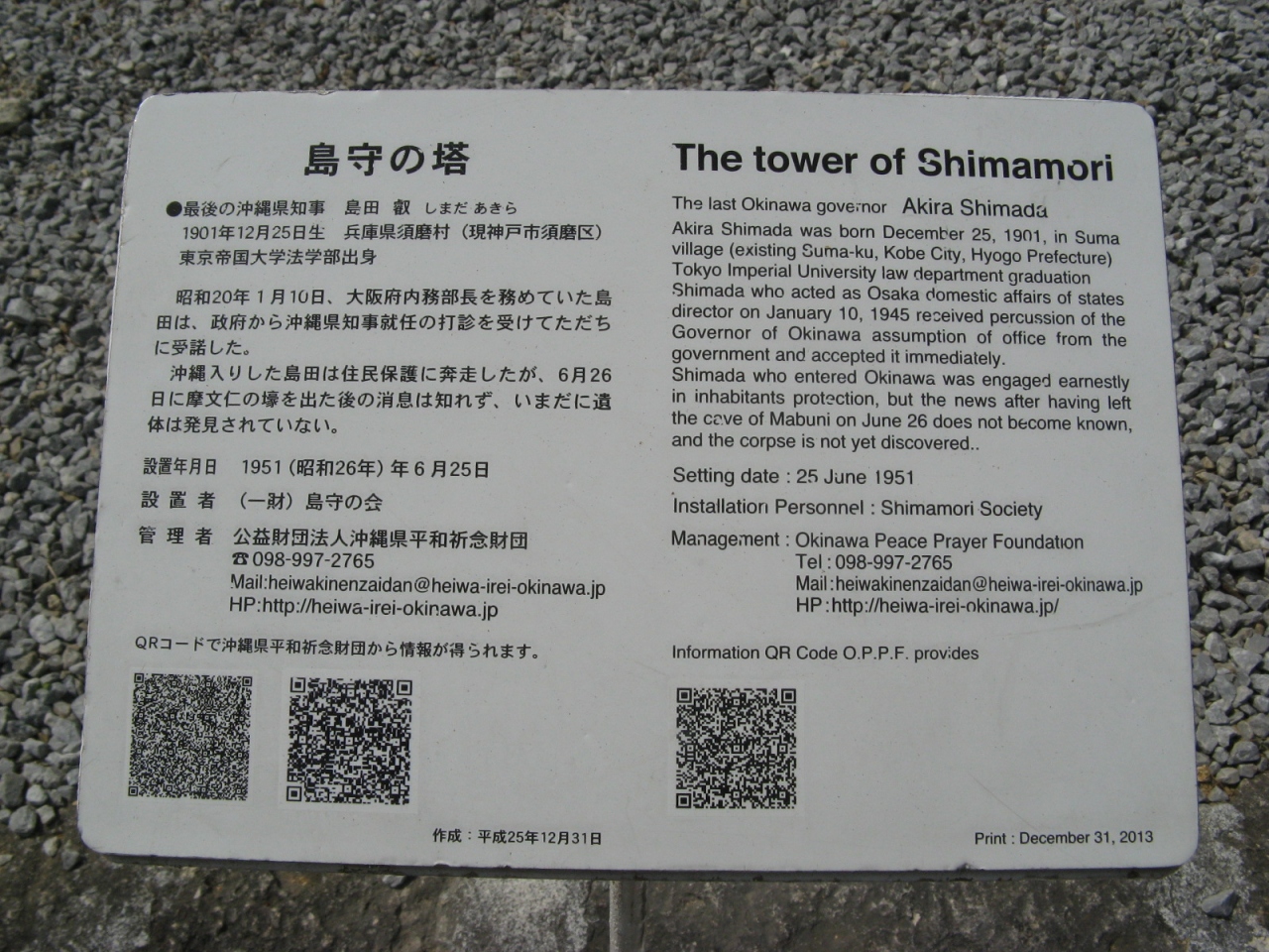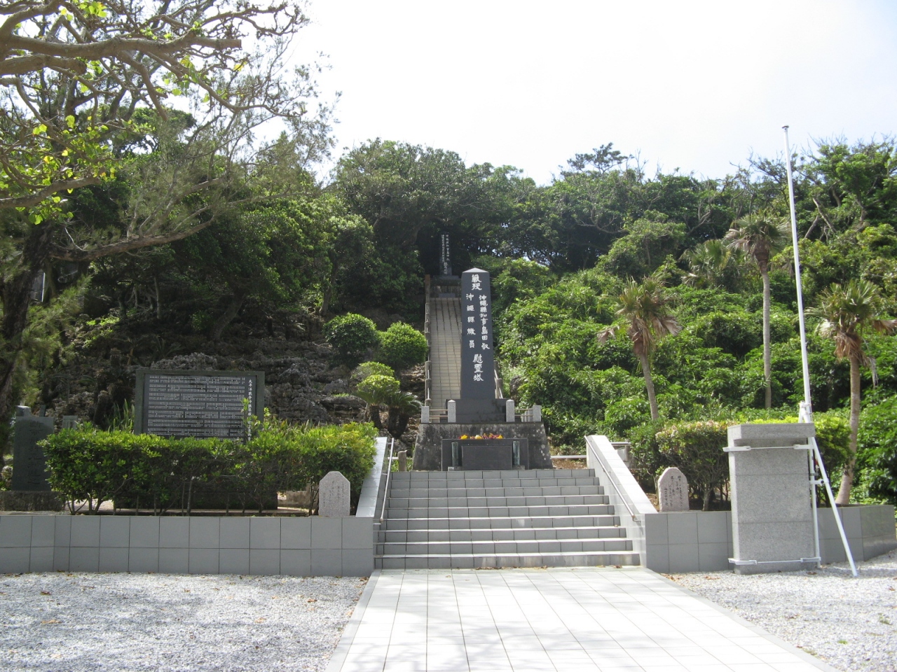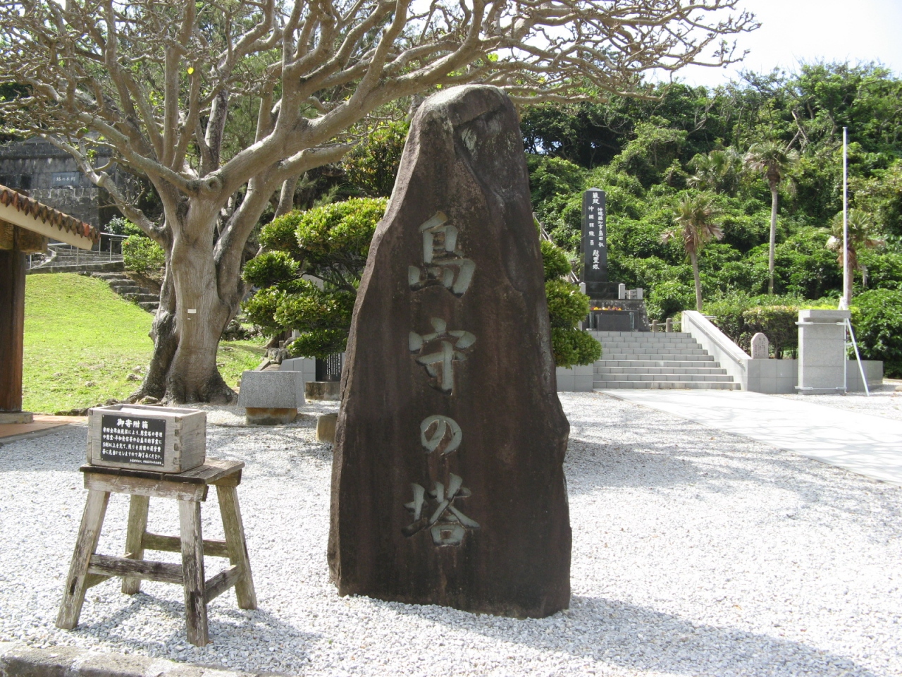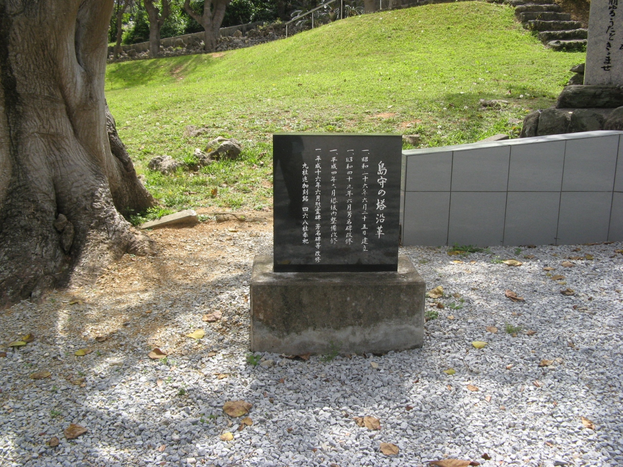 「島守の塔」は、平和祈念公園内の霊域ゾーンにあります。沖縄県最後の官選知事であった島田叡知事と荒井退造警察部長ほか戦没した458人の県庁職員を合祀した塔です。
