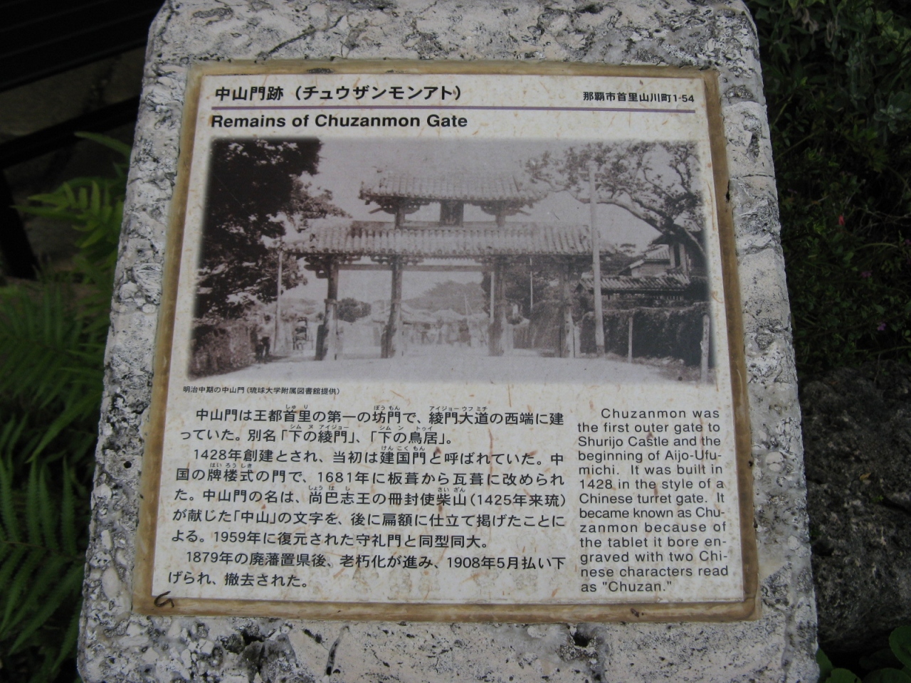 石標には、古い中山門の写真とともに、『中山門は王都首里の第一の坊門(ぼうもん)で、綾門大道(アイジョーウフミチ)の西端に建っていた。別名「下の綾門(シムヌアイジョー)」、「下の鳥居(シムントゥイ)」。1428年の創建とされ、当初は建国門(けんこくもん)と呼ばれていた。中国の牌楼式(はいろうしき)の門で、1681年に板葺から瓦葺に改められた。中山門の名称は、尚巴志(しょうはし)王の冊封使柴山(さいざん)(1425年来琉)が献じた「中山」の文字を、後に扁額(へんがく)に仕立てて掲げたことによる。1959年に復元された守礼門と同型同大。1879年の廃藩置県後、老朽化が進み、1908年5月に払い下げられ、撤去された。』と表記されています。