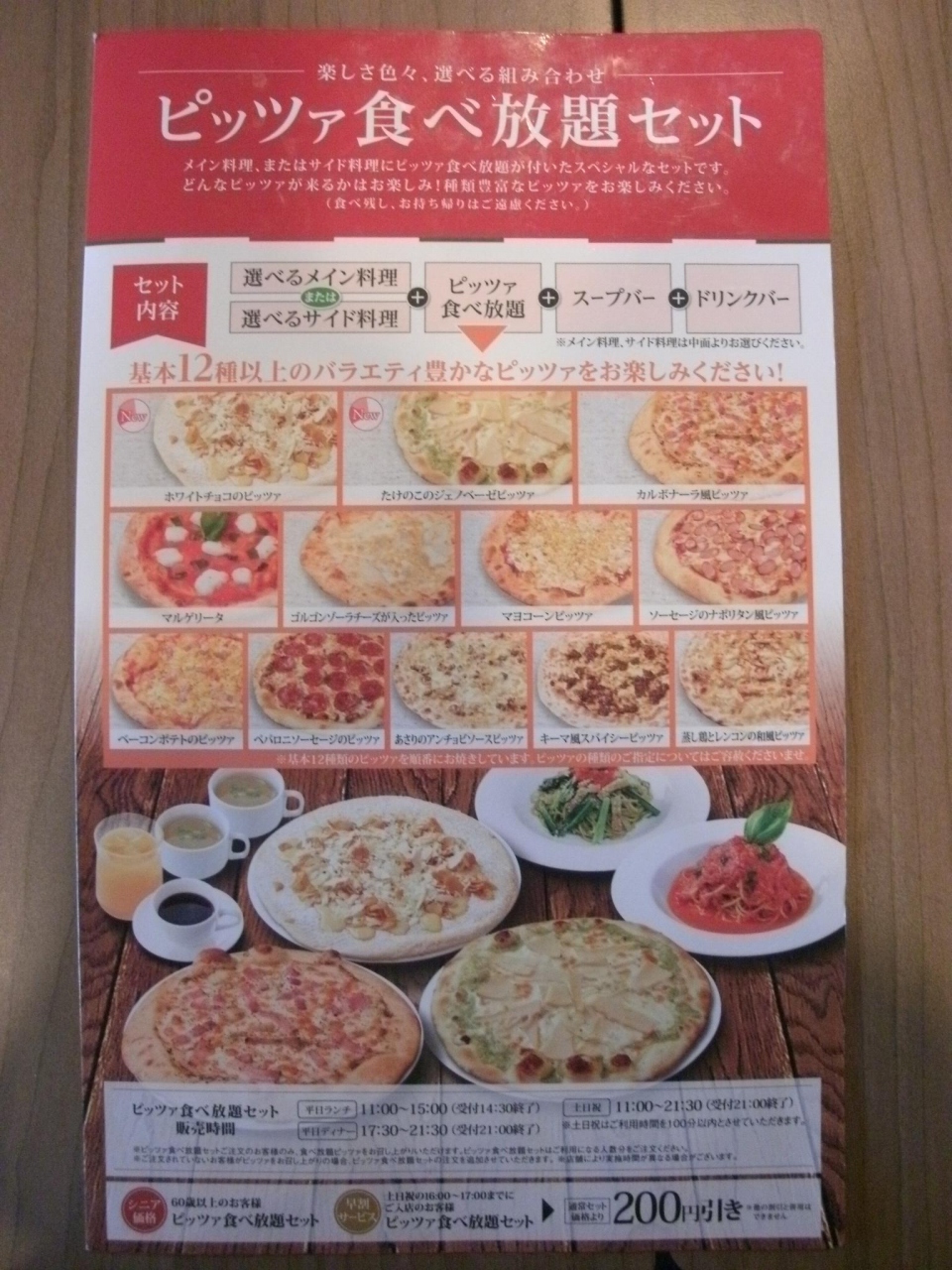 広島を訪れたときに国道2号線を走っていてランチに利用しました。グラッチェガーデンズについては、ここのお店以外にも利用することがありますが、全国展開しているお店なので安しい安心して利用できます。店によっては、ピザの食べ放題がある店とない店がある様ですが、ここのお店は“ピザ食べ放題 1199円”があったので利用しました。添付写真のメニューに示す通り、メイン料理一品かサイド料理2品を選んで、あとは10種類ほどのピザが食べ放題になります。ドリンクバーもついています。ピザは、レギュラーかスモールの二種を選べ、しかも、二種類のピザを半分半分で一枚にして焼いてくれます。従って、たくさんの種類を食べたい人は、スモールサイズにして、二種のピザをオーダーするのがベターです。二人でメインとしてグラッチェコブサラダときのこのマリネ風和風サラダをオーダーして、スモールサイズのピザを全種類(半分づつ)のピザを頂くことができました。安いので、ピザの具は豪華なものではありませんが、安く、おなか一杯食べたい人にオススメです。