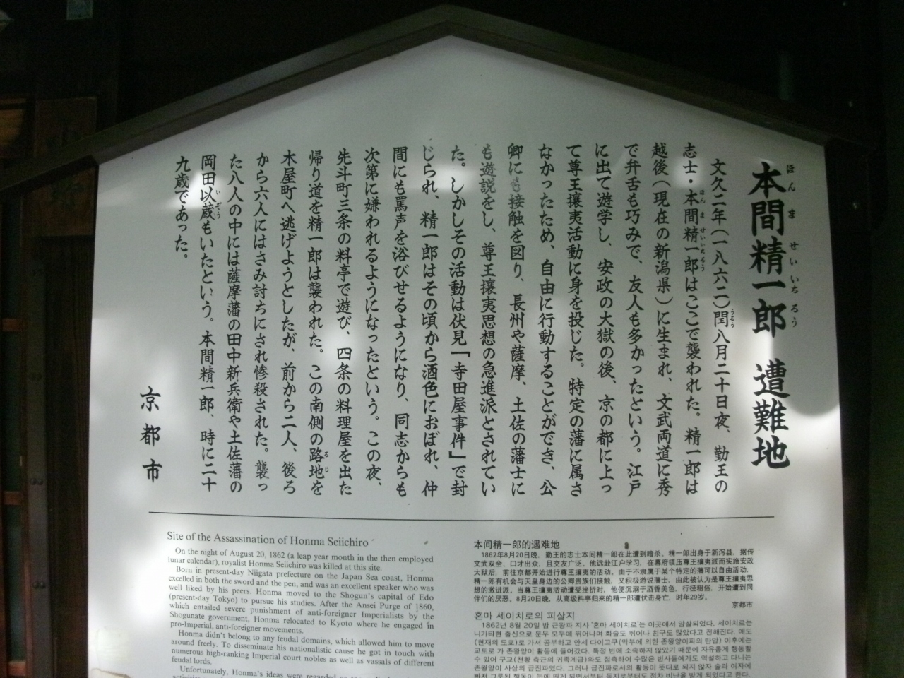 四条通りから、高瀬川沿いの木屋町通りを北向きに歩いていた時に、偶然、見つけました。木屋町通りの東側、民家の前に「本間精一郎遭難の地」の石碑と説明板があります。説明板には『本間精一郎は、新潟県に生まれ、京に上り尊王攘夷運動に身を投じたが、寺田屋事件で挫折し、身を持ち崩して同志からも嫌われるようになって殺害された』という意味の説明が書かれています(詳細は添付写真を参照ください)。付近には幕末の志士達の隠れ家や暗殺の場を示す碑が数多く立っているので、幕末の歴史好きの方に散策をオススメします。