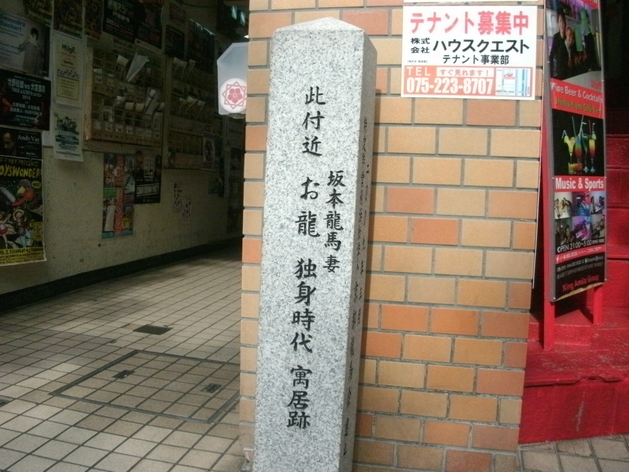 木屋町通りの高瀬川山崎橋東詰めを下がったところ、都会館“龍馬”前に「お龍 独身時代 寓居跡」の石碑が立っています。2009年3月に立てられた比較的新しい高さ1mほどの小さな石碑です。のちに龍馬の妻となるお龍が母や妹、弟たちとこの辺りに住んでいたそうで、正確な位置は不明なことから「此付近」という表示になっています。説明板もないし、石碑だけで特別観るようなものもありませんが、この辺り一帯には、竜馬に関する史跡がたくさんあるので、竜馬ファンは合わせて観て回ればよいでしょう。