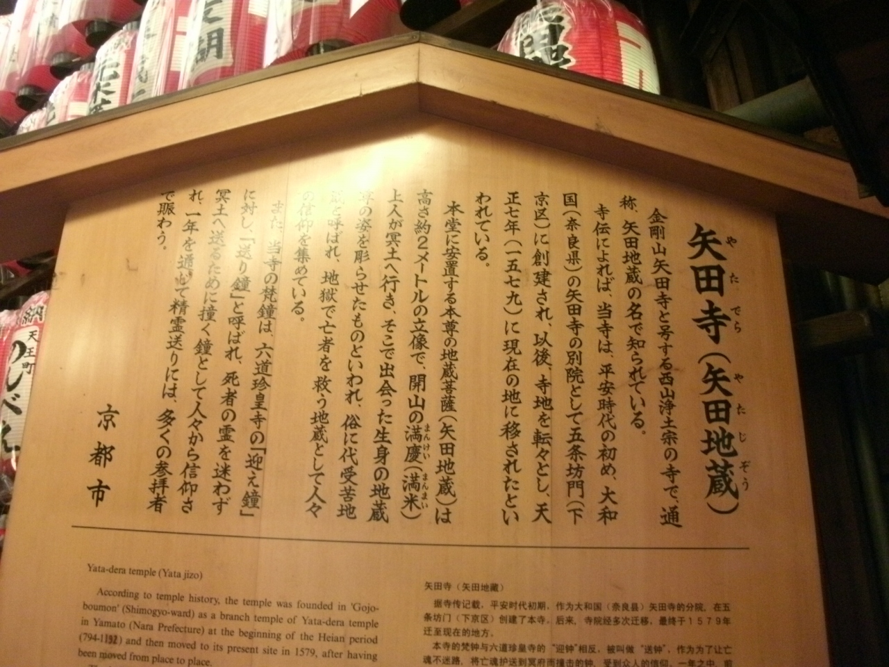 阪急電車の河原町駅から歩いて5分ほど、アーケードがかかる新京極通りの中ほどにあります。正式には永福寺という名前だそうで、蛸薬師という名前は諸説あるようですが、かつてこの寺にいた親孝行な僧が病身の母の求めで「タコ」を買ったが見とがめられ、進退窮まった僧が日頃信仰する薬師如来に祈念したところ、タコは薬師経に変わり、また母の病が癒えたというの説が一番有名だそうです。詳細は添付写真の駒札を参照ください。