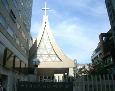 河原町三条を北に少し上がった右手に「カトリック河原町教会」があります。100年以上の歴史がある古い教会ですが、ビルの谷間にあって高くそびえる建物は近代的な感じで周辺のビル群に溶け込んでいます。ミサがない時には信者でなくても、自由に見学することができます。周辺は京都市で最も賑やかなところですが、内部に入ると凛とした空気感が素晴らしく、静かな時を過ごすことができます。