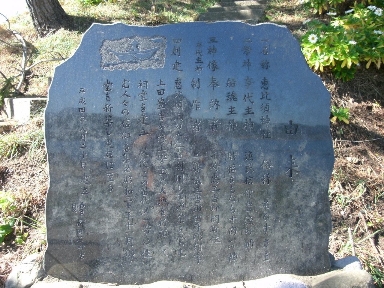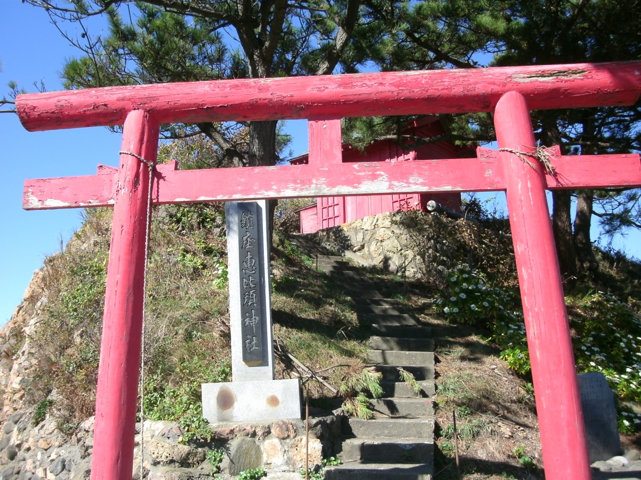 深浦町の中心部にほど近い所、国道101号線を走っていると「大岩入口」というバス停があり、国道を挟んで海岸沿いに小さな神社(恵比寿神社)があります。神社は、真っ赤に塗られた鳥居の向こうに建つ木造平屋建、桁行2間ほどの小さな造りで、海上安全と大漁祈願の神として周辺住民から信仰されていると由緒書き(添付写真参照)にありました。