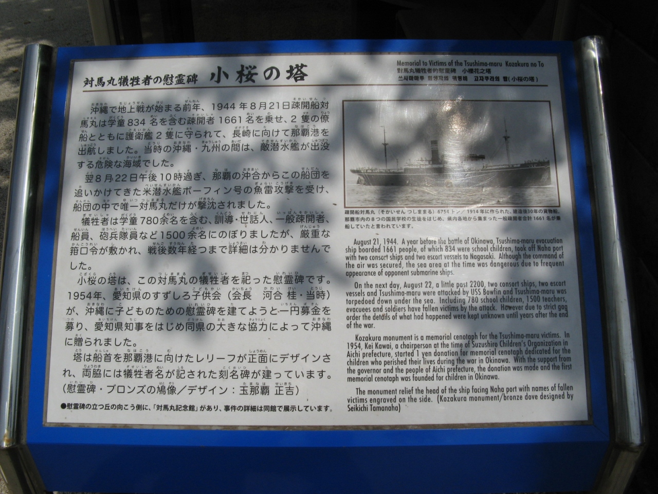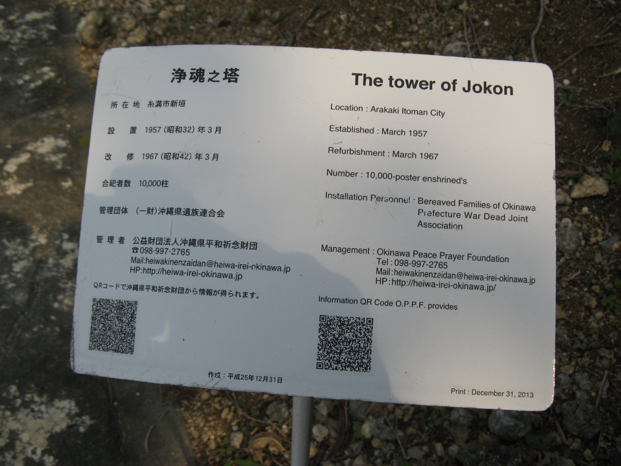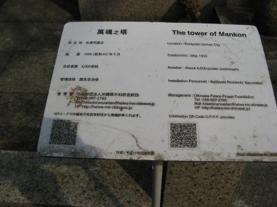 塔の立つ糸満市国吉部落一帯は日本軍と米軍が激しい戦闘を繰り広げたところで、戦後、国吉部落民が各地に散らばった遺骨を集めて洞窟に納め、1955年(昭和30年)5月にコンクリート製の塔を建立し、無名戦士4,000余名をお祀つりしているものです。無名戦士の慰霊塔だけに、記名などない納骨堂だけの簡素なものですが花が手向けられ、大切に守られているいる様子に感銘を受けました。沖縄戦と戦後の平和を考えながら、日本のために尊い命を犠牲にされたご英霊に対し、尊崇の念を表し、御霊安らかなれとお祈り致しました。- 旅行時期