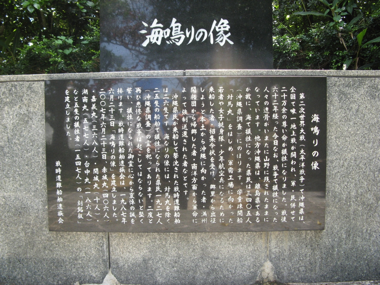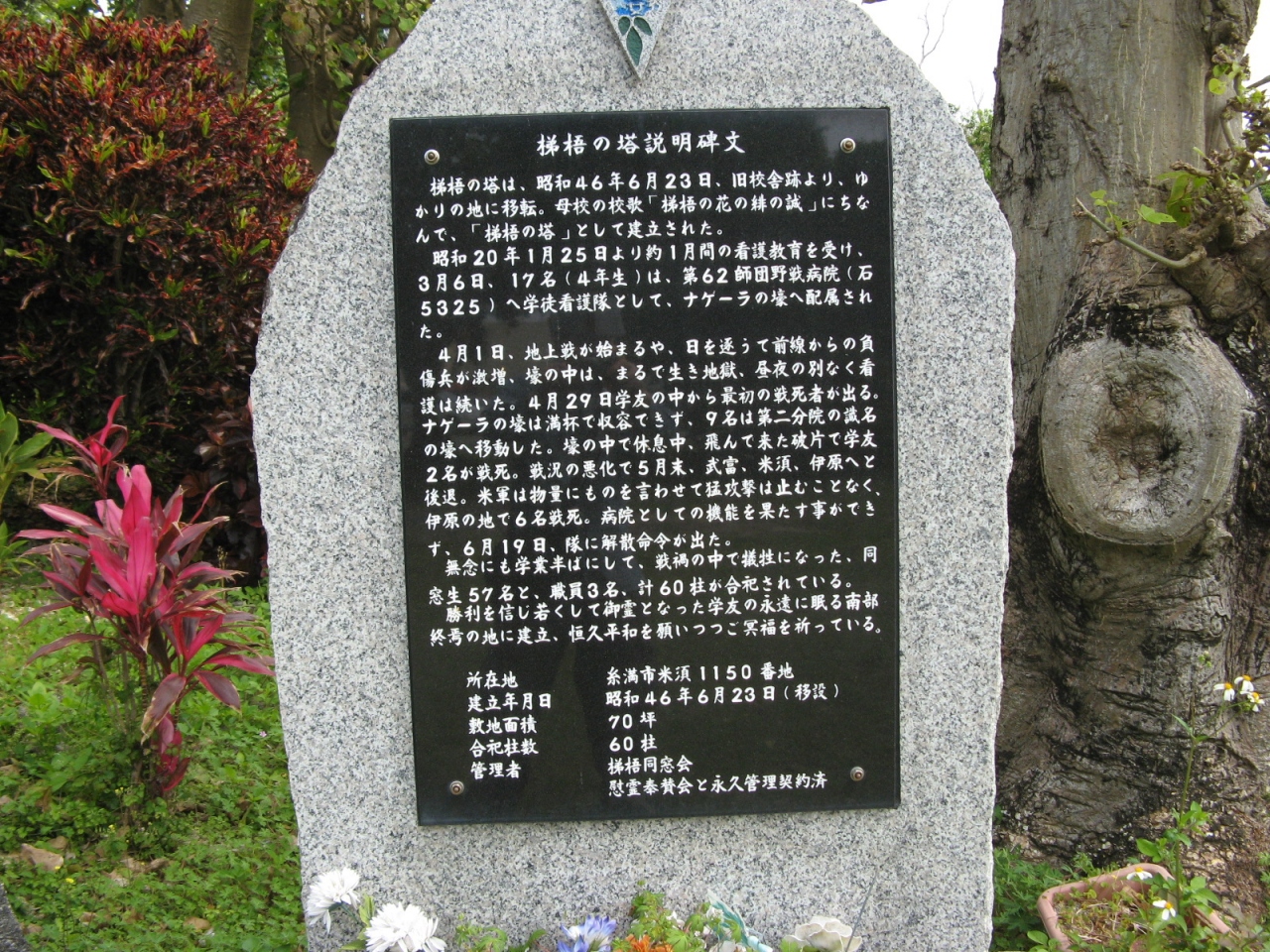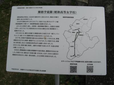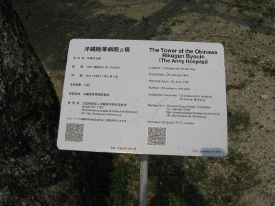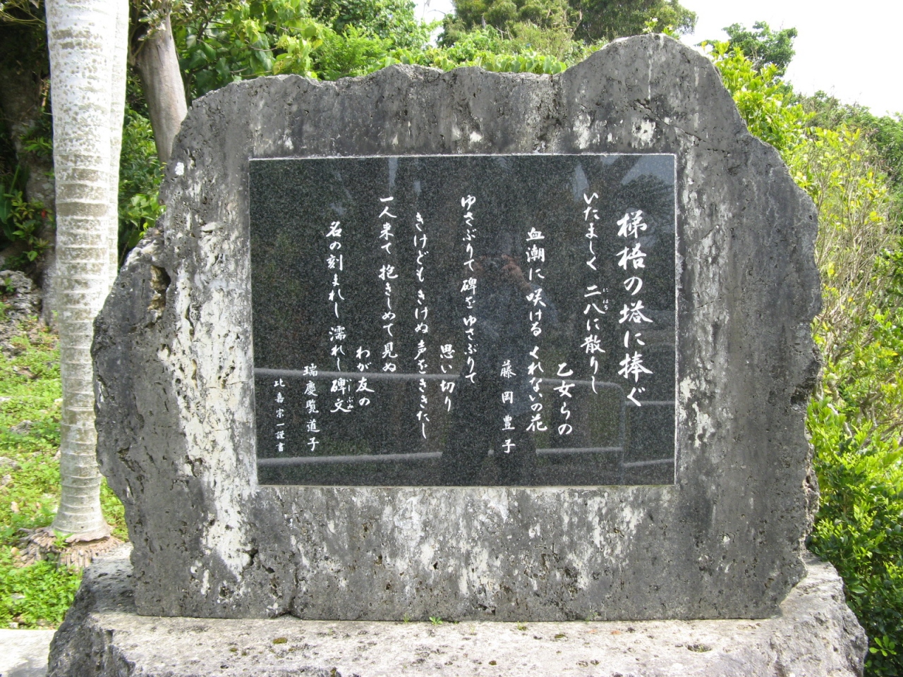 沖縄線末期、ここで傷病兵の治療にあたった沖縄陸軍病院勤務の関係者43名を祀る慰霊塔です。慰霊塔の横には、『春くると ひたすら待ちし 若草の 萌え立ついのち 君は捧げぬ』 『水汲みに 行きし看護師 死ににけり 患者の水筒 四つ持ちしまま』と刻まれた歌碑があり、当時の様子が偲ばれて胸に来るものがありました。- 旅行時期
