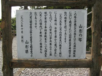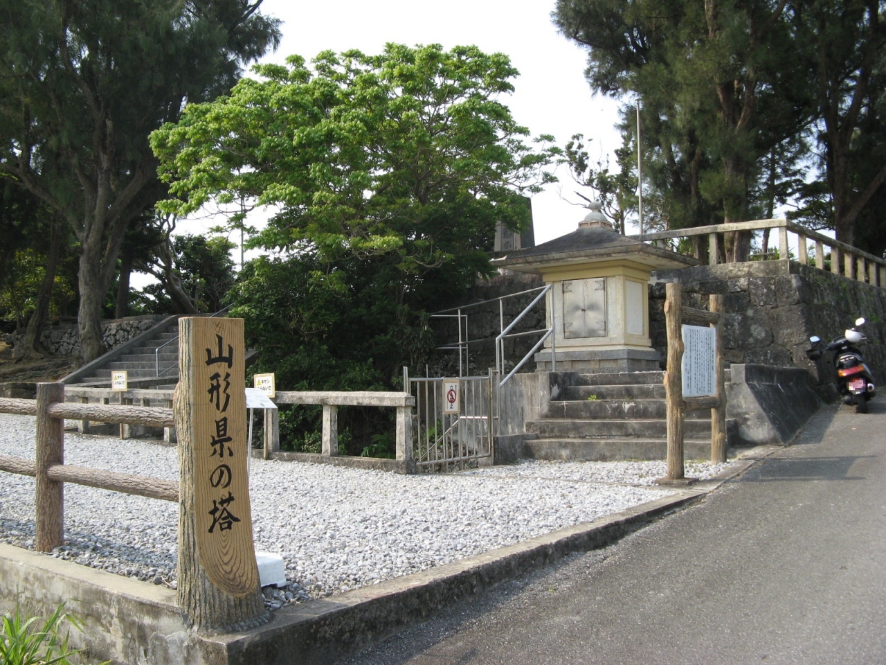 沖縄をはじめ海外諸地域において戦没された山形県出身者四万余柱の霊がお祀りされています。現地にある説明版には『この塔は、沖縄(776柱)をはじめ海外諸地域において戦没された山形県出身者四万余柱の諸霊を祀ってあります。1965年2月に山形県民の総意と誠心による碑石、台座を県から運び建立したもので、この聖地は歩兵第三十二連隊が、軍旗を奉持勇戦奮闘し、1945年8月にこの壕内で奉焼した由緒ある丘であります。』