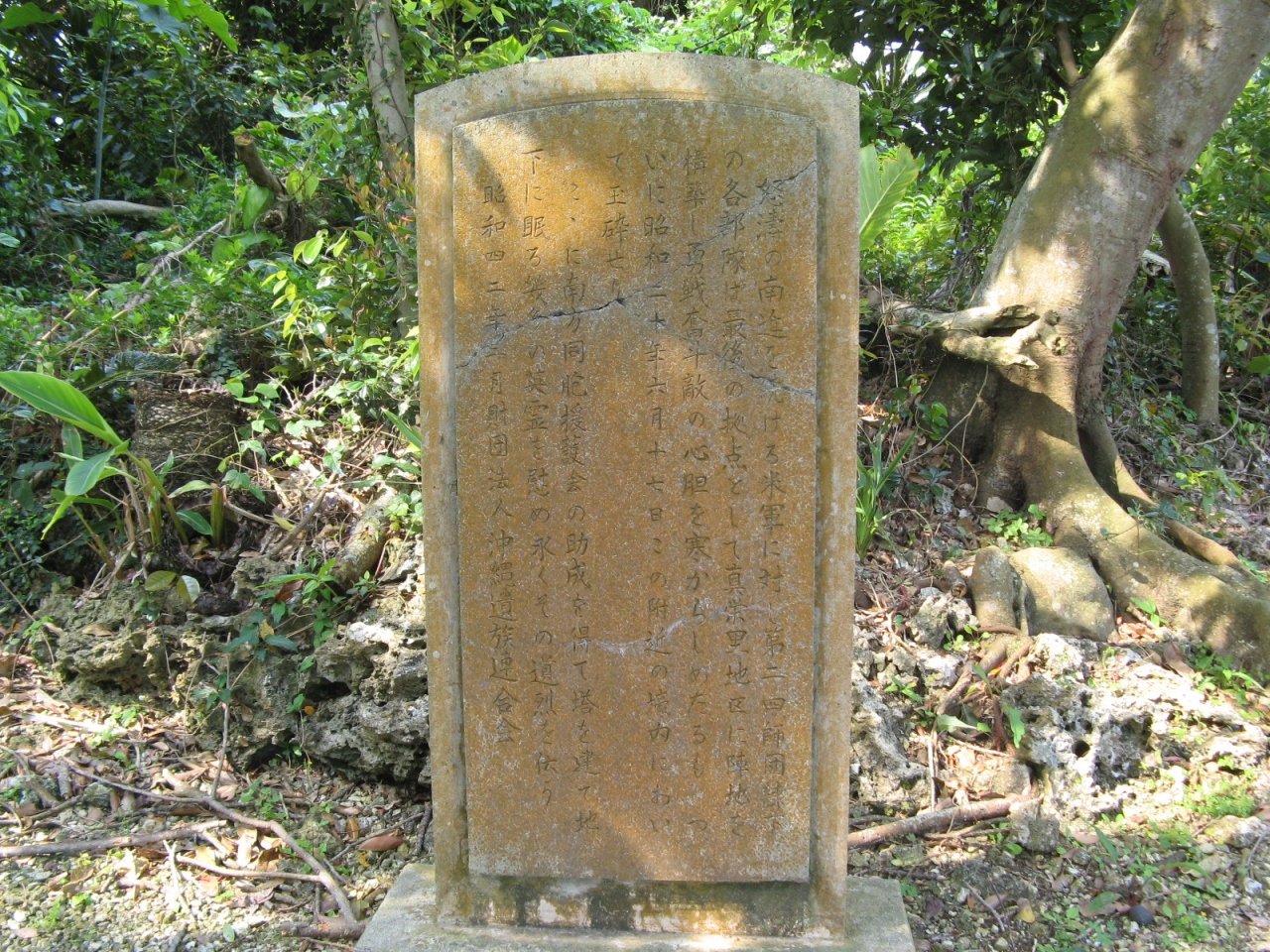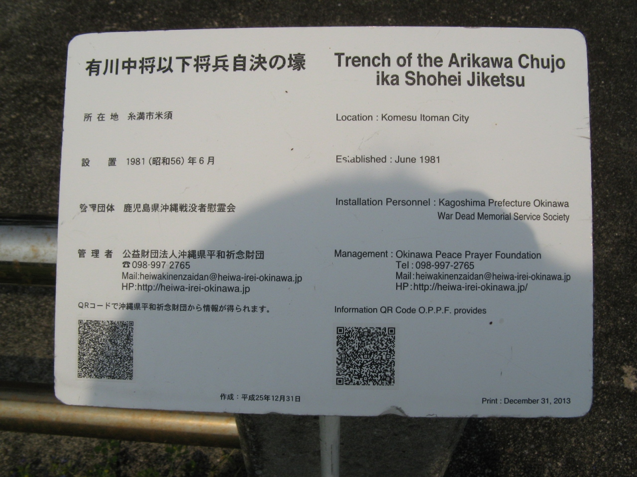 有川中将は歩兵第64旅団長として首里方面防衛の矢面に立ち奮戦していましたが、圧倒的な米軍戦力により旅団は玉砕し、昭和20年6月21日の未明に、有川中将以下、一部の将兵と共にこの壕で自決された。壕は薄暗く、足場は悪いですが柵もないので入れないことはありませんが、部外者が入るべきところではないと考え、外から尊崇の念を込めて御霊安かれとお祈り申し上げました。- 旅行時期