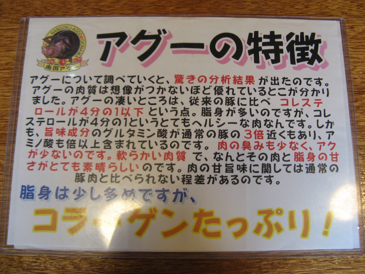 待つことしばし、到着した“アグーカツカレー大”は、見た目たいしたボリュームはないと思いましたが、カレールーの下にもカツが一枚分入っていてトータル二枚分のカツがあって、ボリュームたっぷりでたいへん食べごたえがありました。これまで、いろんなお店でたくさんカツカレーを食べてきましたが、 750円でカツが二枚も乗ったカレーは見たこともなく、ましてや“アグーのカツ”と言えば、それだけでも少なくても千数百円するお店が多いので、本当にリーズナブルなお店だと思いました。敷地内に併設されている?自社専用飼育場”でアグー豚を育てているため、安価で美味しいものを提供できるのだそうです。