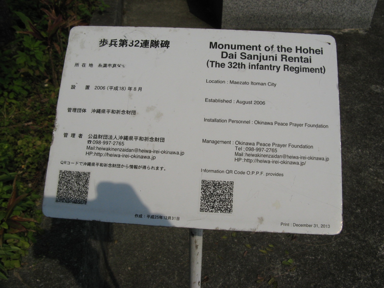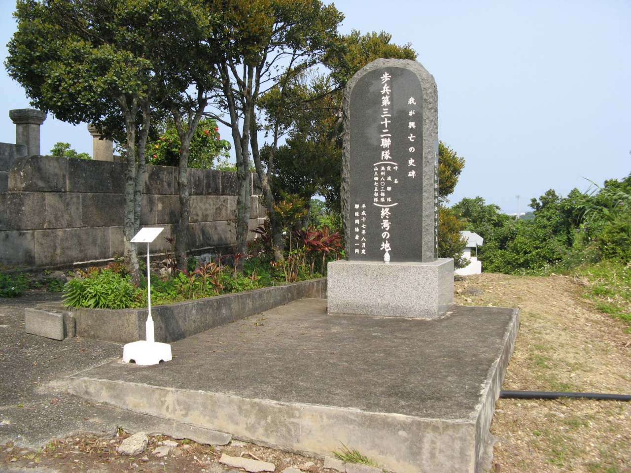 この地は、沖縄戦の末期、主に山形県出身者で編成されていた歩兵第三十二連隊が、敵の手に渡ることを防ぐため軍旗を奉焼した由緒ある地(終焉の地)で、向かいには、「山形の塔」もあります。碑は平成17年(2005年)8月に歩兵第三十二連隊で生き残った隊員の方々が建立したものです。祖国防衛のために命をかけて戦われた先人をしのび、戦没された英霊のご冥福をお祈り申し上げました。- 旅行時期